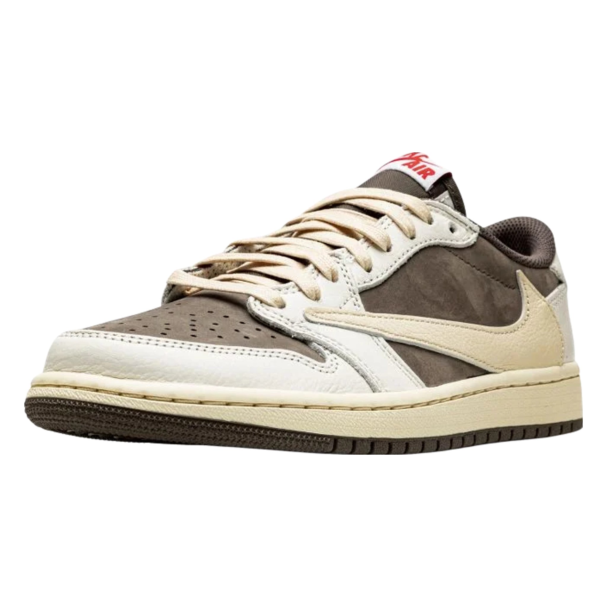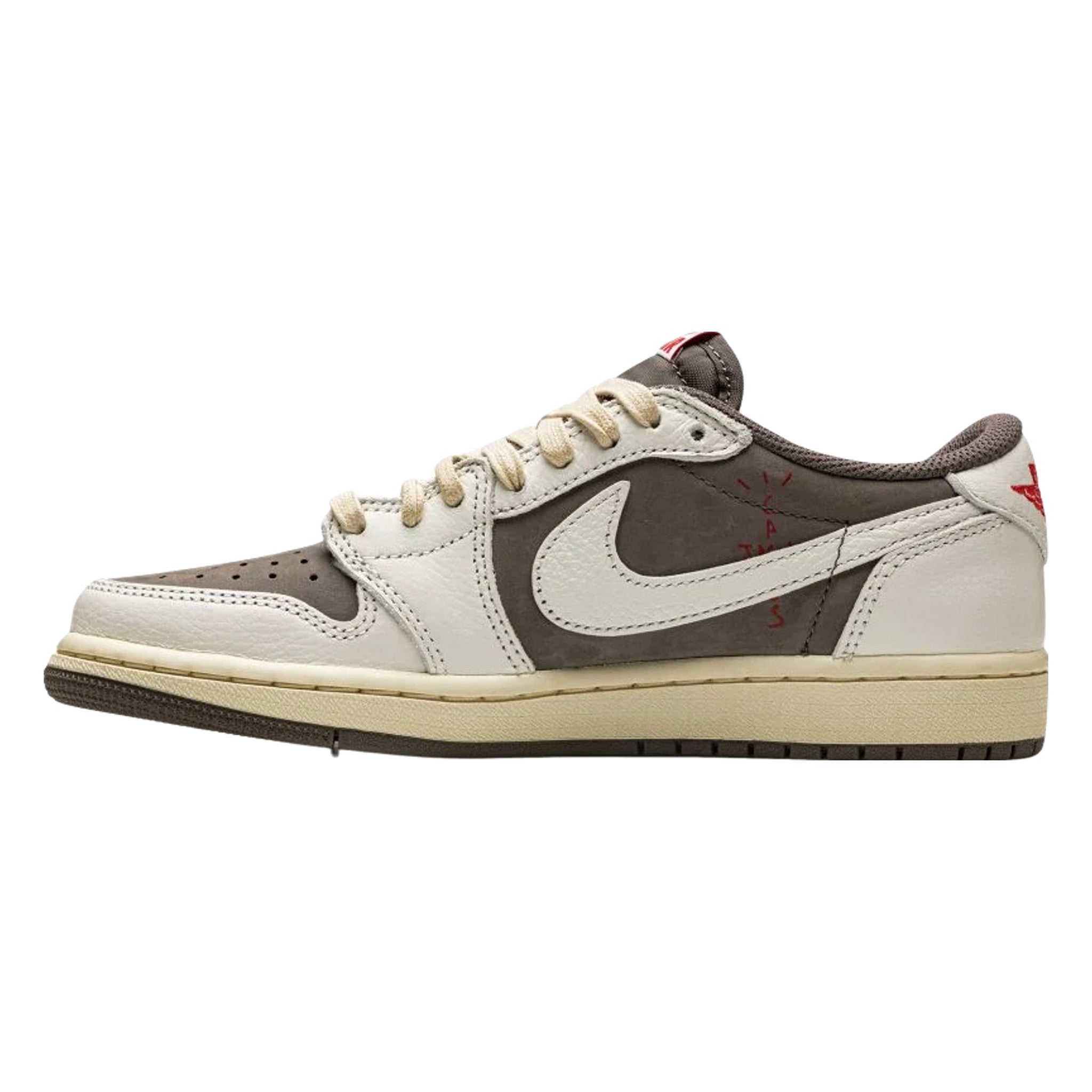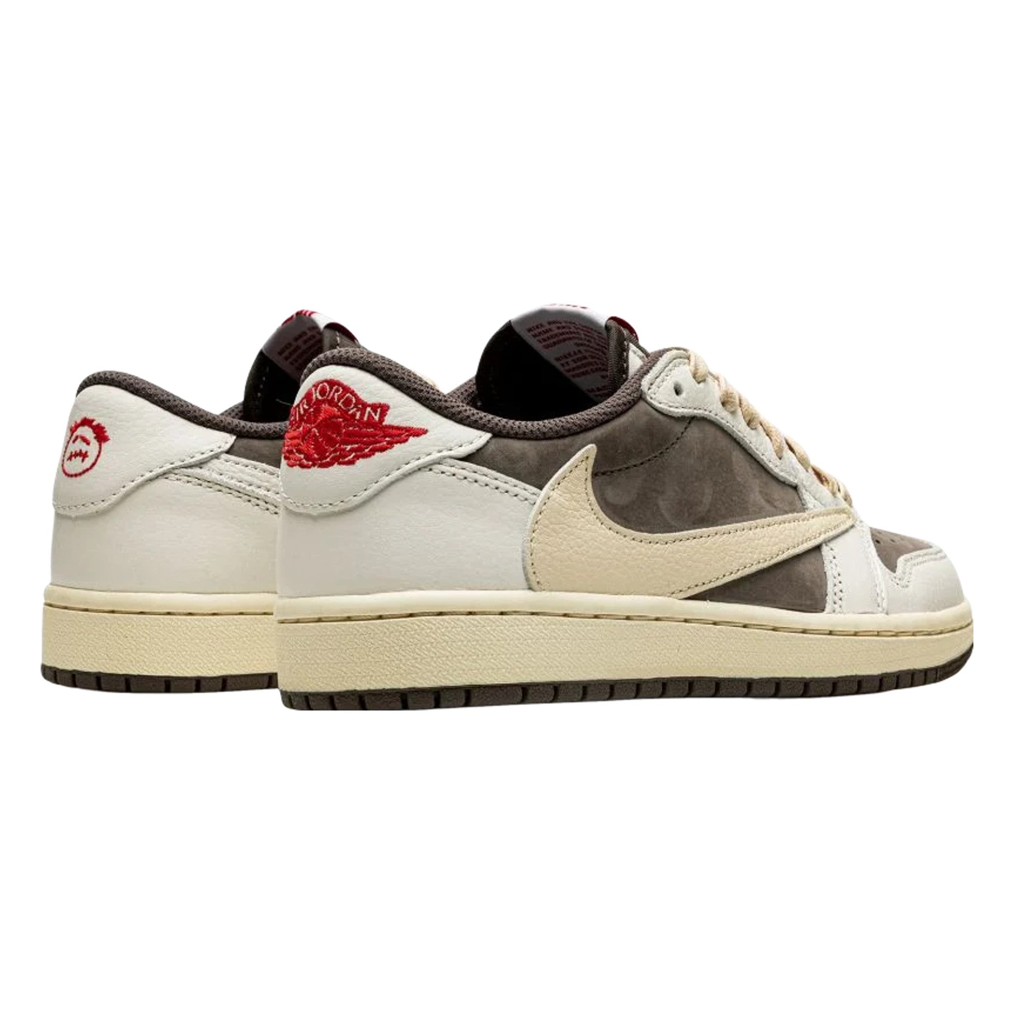 The Trvis Sctt x Ar Jrdn 1 Low “Reverse Mocha” is a collaboration between the hip-hop artist and Jrdn Brand on the low-top lifestyle shoe that “reverses” the color block of the duo’s original Jrdn 1 Low collaboration from 2019. Released in July 2022, the “Reverse Mocha” features the same color block as Travis and Jrdn Brand’s “Mocha” or “Cactus Jack” Jrdn 1 Low, albeit in a flipped color coordination. The perforated toe, mid-panel, and collar are designed in mocha (brown) nubuck. White leather overlays on the toe cap, forefoot, eyelets, and heel contrast the upper’s earth tone base. A backwards cream-colored leather, a signature branding element to many of Travis’s sneaker projects, appears on the sides. A smiley face logo is embroidered in red on the left heel while a classic “Wings” logo is embroidered in red on the right heel.