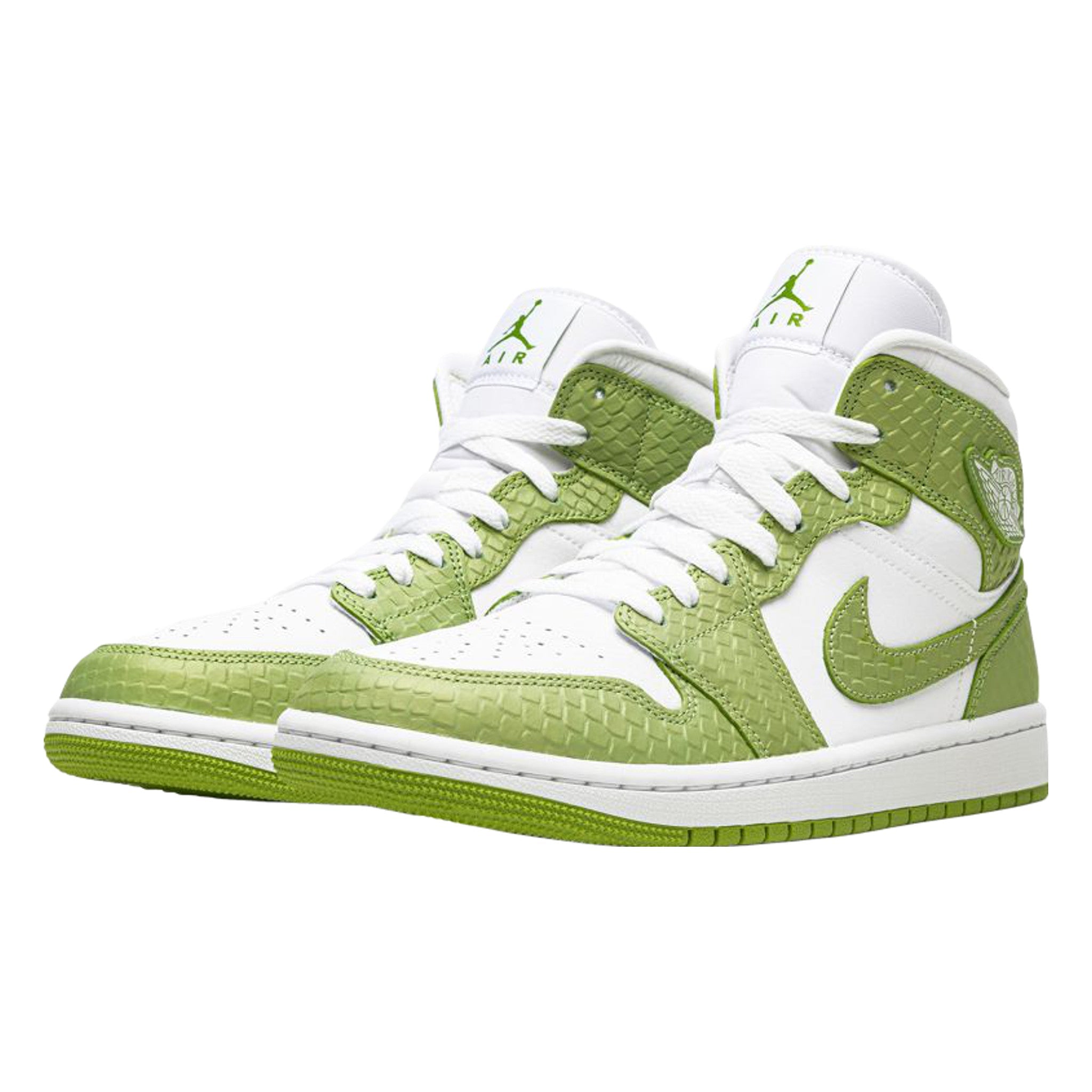 The Women’s Ar Jordn 1 Mid SE “Green Python” is a women’s-exclusive version of the mid-top lifestyle shoe that makes use of a reptilian-inspired textile on its design. This May 2022 release turns heads with olive green-colored leather overlays with python patterning. The snake-inspired accenting appears on the toe cap, forefoot, eyelets, collar, heel. A raised “Wings” logo resides on the collar and green and “Ar” branding can be found on the white nylon tongue tag.