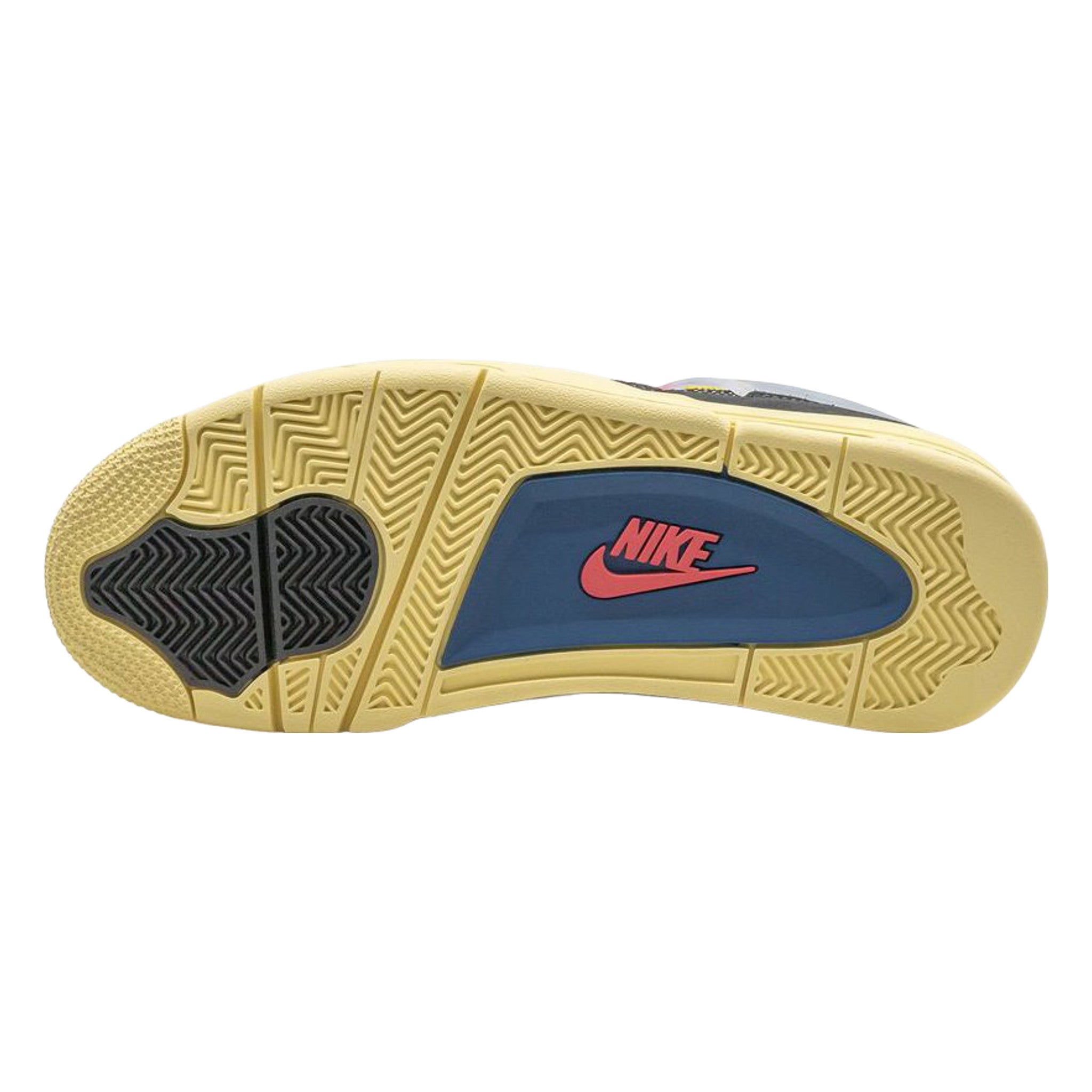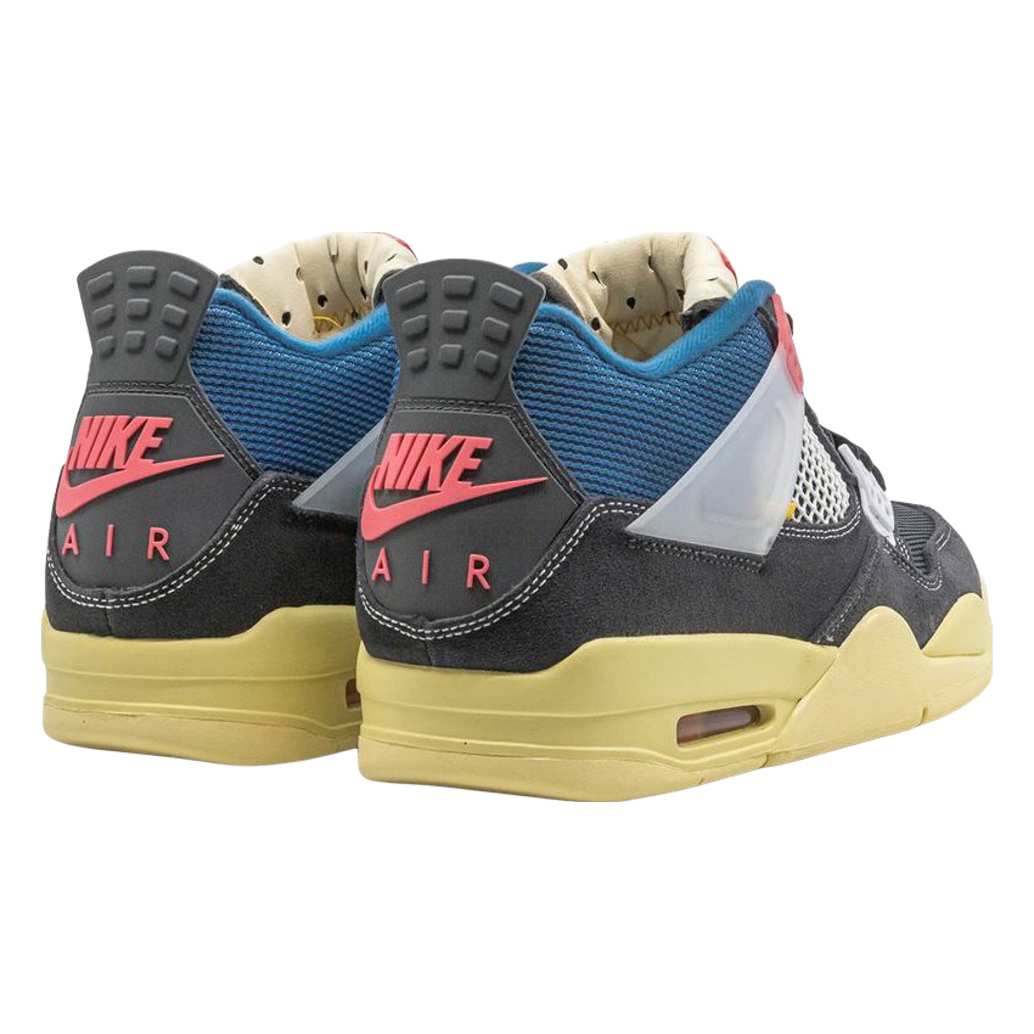 The Union x Ar Jordn 4 “Off Noir” is one of two desirable colorways produced exclusively for the Los Angeles boutique and Jordn Brand’s Summer 2020 collaboration. The “Off Black” or “Off Noir” design of Union’s Ar Jordn 4 collection features a radically new and exciting color scheme that incorporates elements of vintage sportswear. A premium washed black plush suede appears on the mudguard, toe cap, and eyelets. Black and blue mesh detailing can be found on the toe and collar, respectively. Pink and grey plastic eyelet accents and a translucent lace support wing add to the unique appearance of the shoe. Additional style cues include white netting on the tongue and mid-panel, pink “Nk Ar” on the black plastic heel cup, and a vintage inspired yellow sole. A shortened tongue measured to the specifications of Chris Gibbs, Union’s owner, is folded over and stitched down. The wearer has the ability to remove the stitching to obtain a traditional Ar Jordn 4 look.