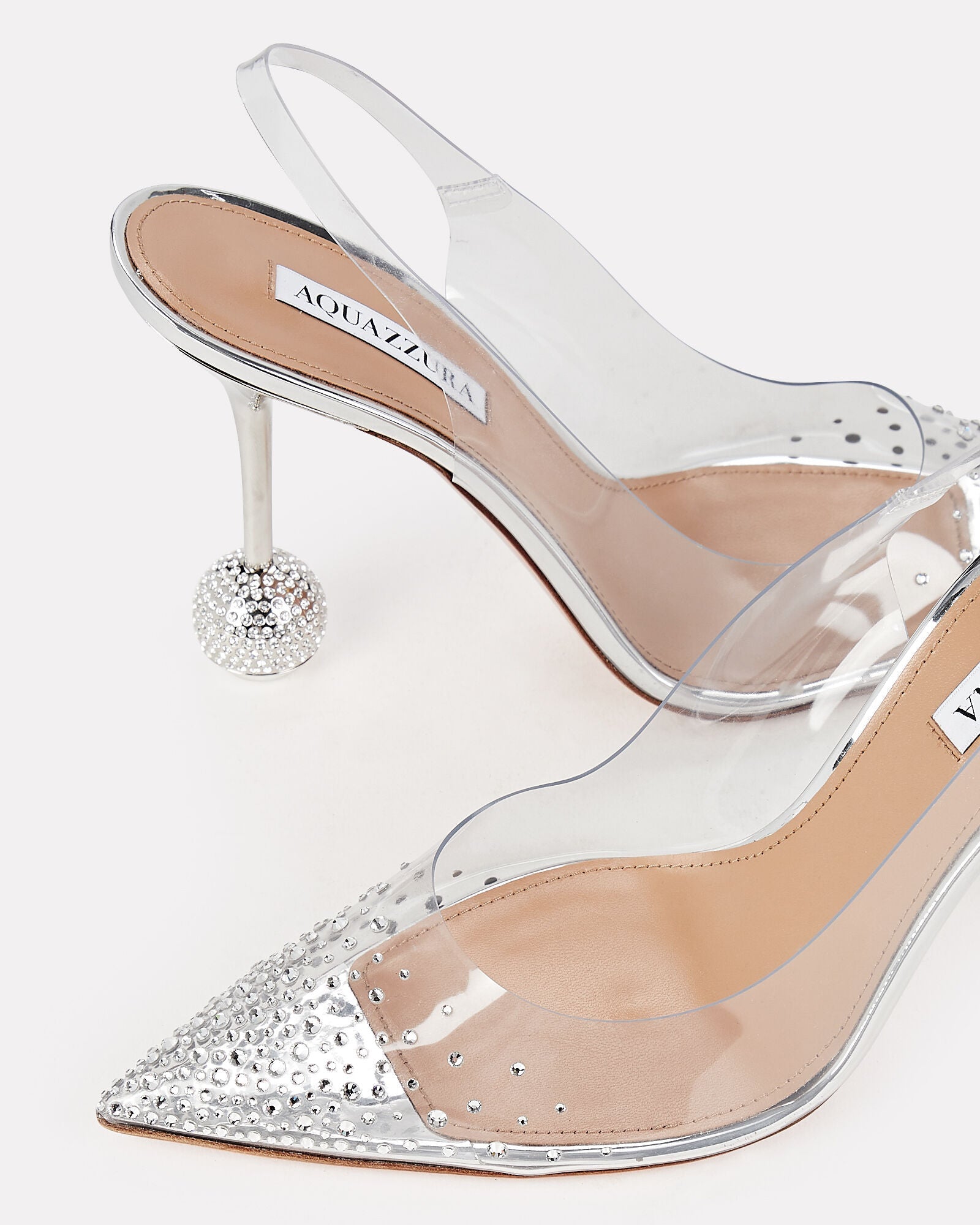 Step into party-ready glamour with the label's Yes Darling sling-back pumps in silvery leather with a crystal-embellished disco ball adorning the heel.