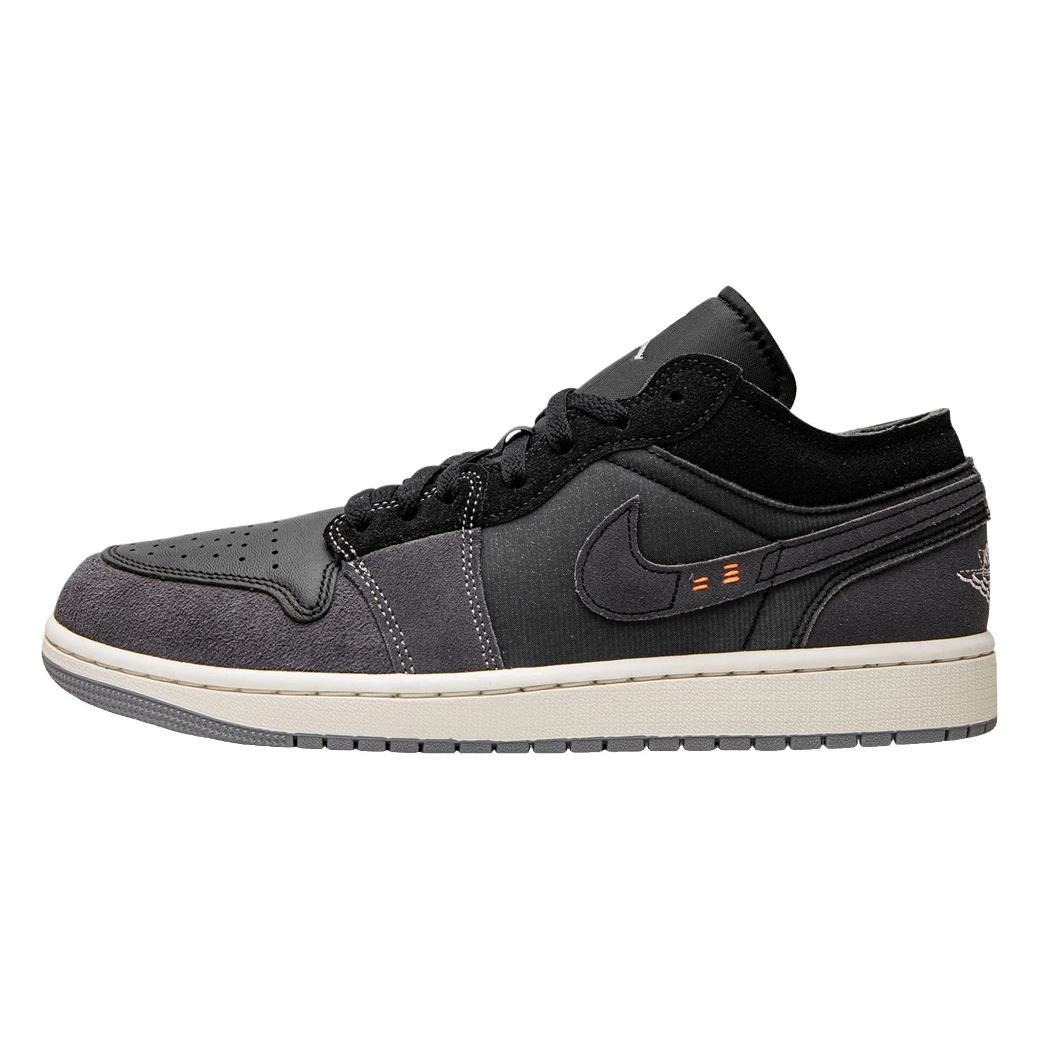 The Ar Jrdn 1 Low Craft “Inside Out” is a colorway of the retro basketball shoe with a unique construction. The “Inside Out,” as its name implies, “reverses” the construction of the popular Ar Jrdn 1 Low by featuring foam padding on the outside of its design to appear as if the inside of the shoe is on the outside. Specifically, the perforated toe is designed in black leather while grey foam padding is found on the toe, forefoot, mid-panel, and heel. The material also appears. A white “Wings” logo is embroidered on the back of the shoe and a white is found on the black nylon tongue.