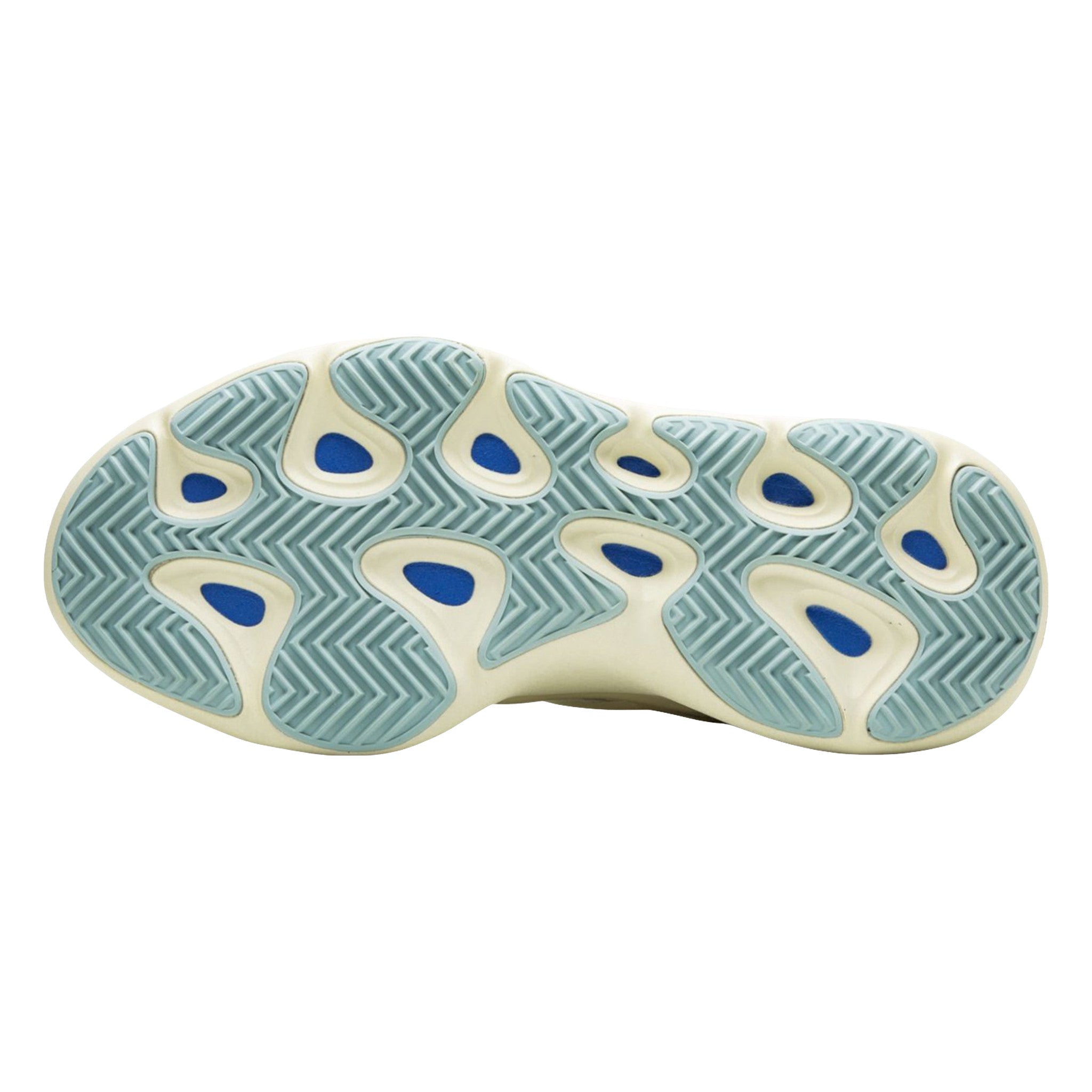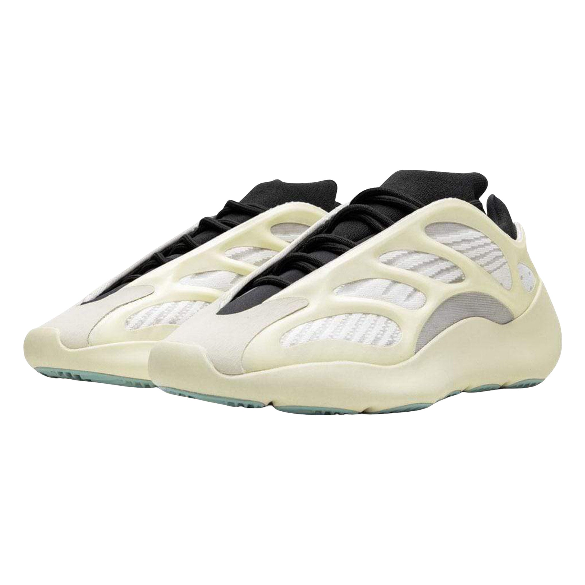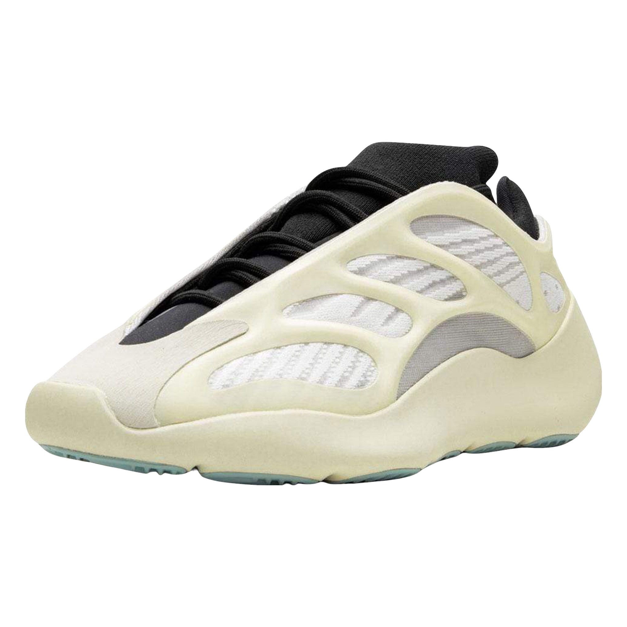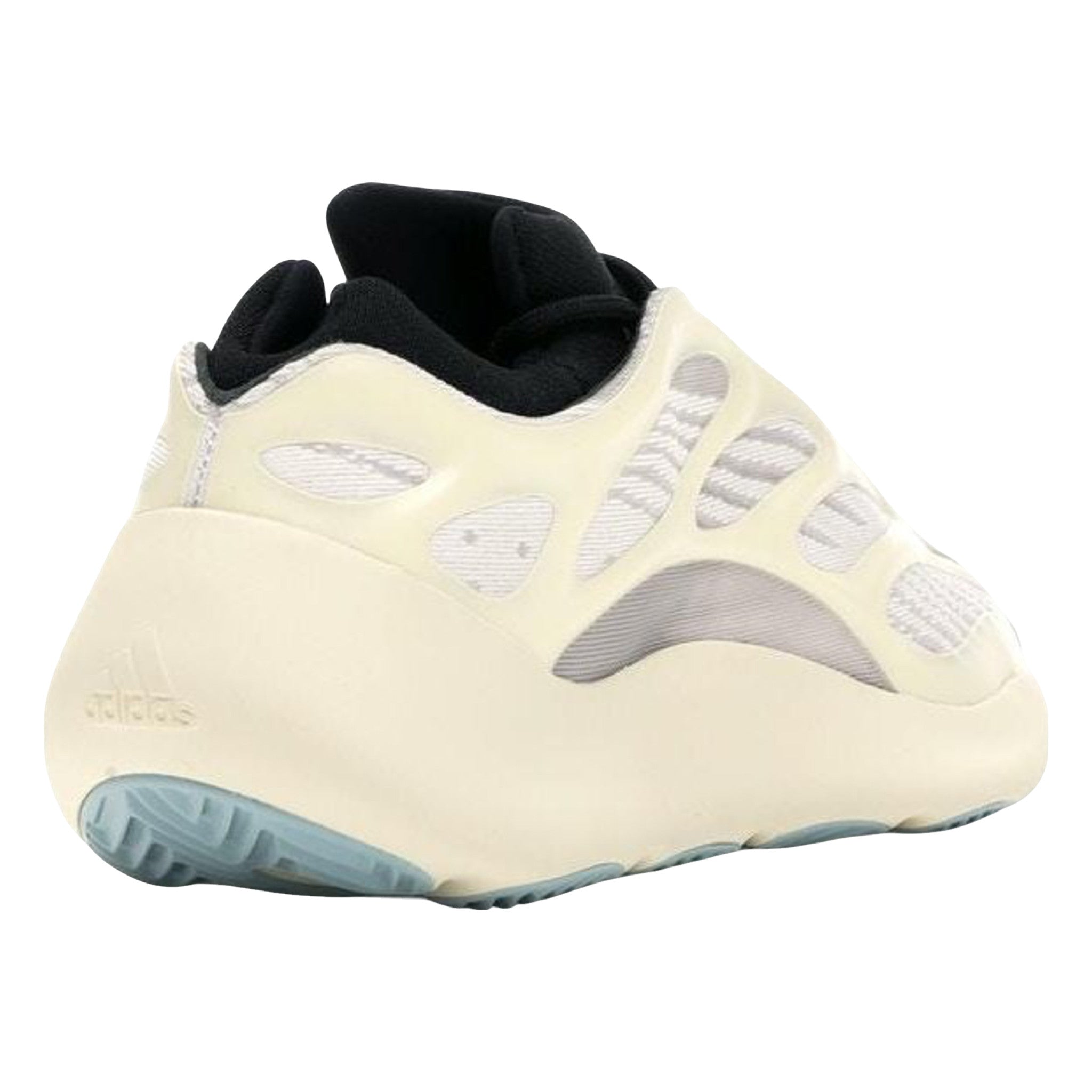 The Yzy 700 V3 “Azael” is the evolutionary third version of Kanye West’s chunky silhouette that combines vintage performance basketball aesthetics with lifestyle detailing. The Winter 2019 release finds a few noticeable differences from previous Yzy 700 models and mirrors the futuristic vibes of the adidas Kobe 2’s upper with its newly incorporated bulky RPU overlay cages. This debut colorway of the Yzy 700 V3 features a white engineered mesh base with the aforementioned cages contrasted by a black nylon tongue and tonal laces. A chunky white bone midsole is nearly double in size of prior Yzy 700 models for a supportive feel and bold look. Light blue traction pods protect the blue-accented cushioning encapsulated within the sole.