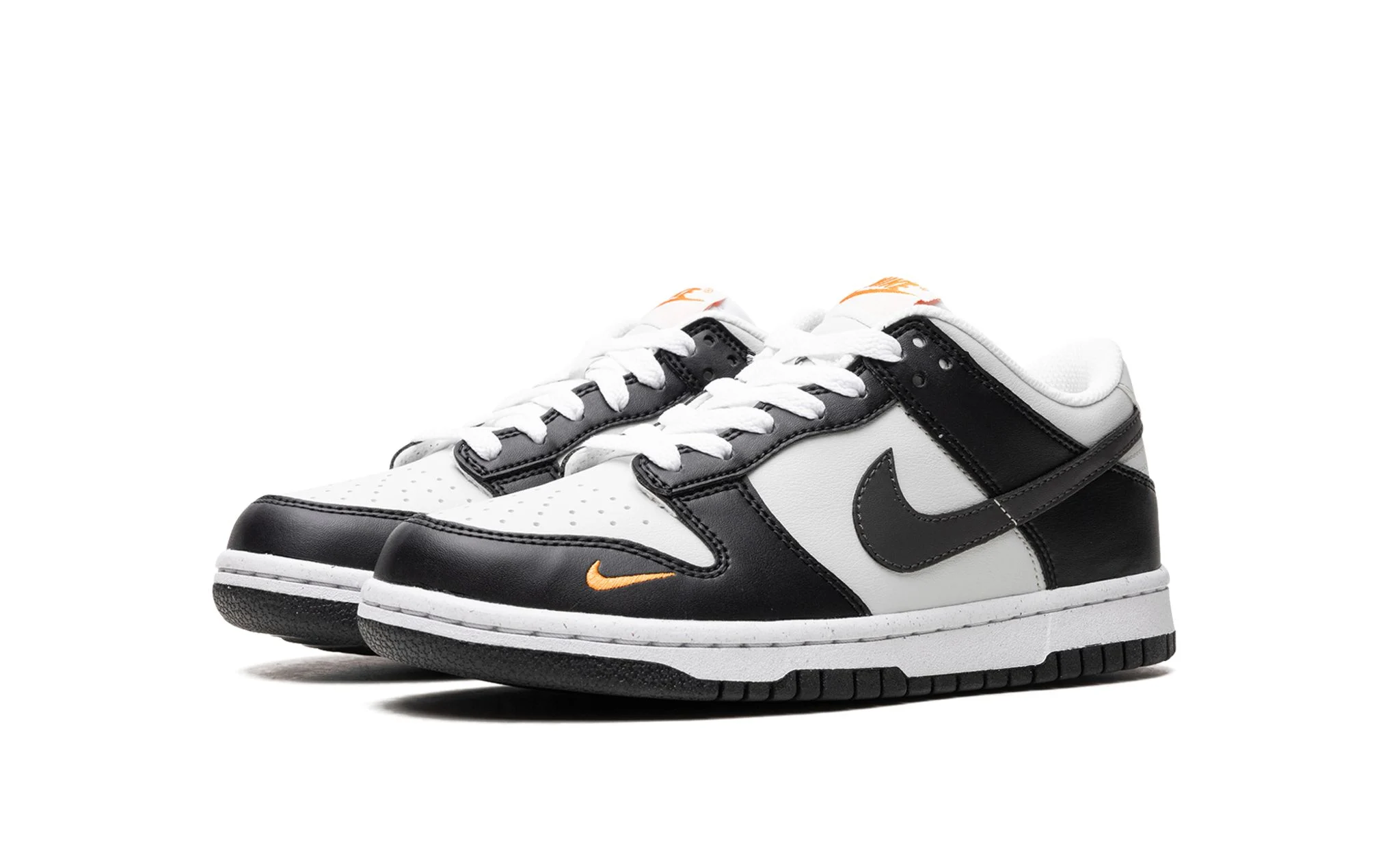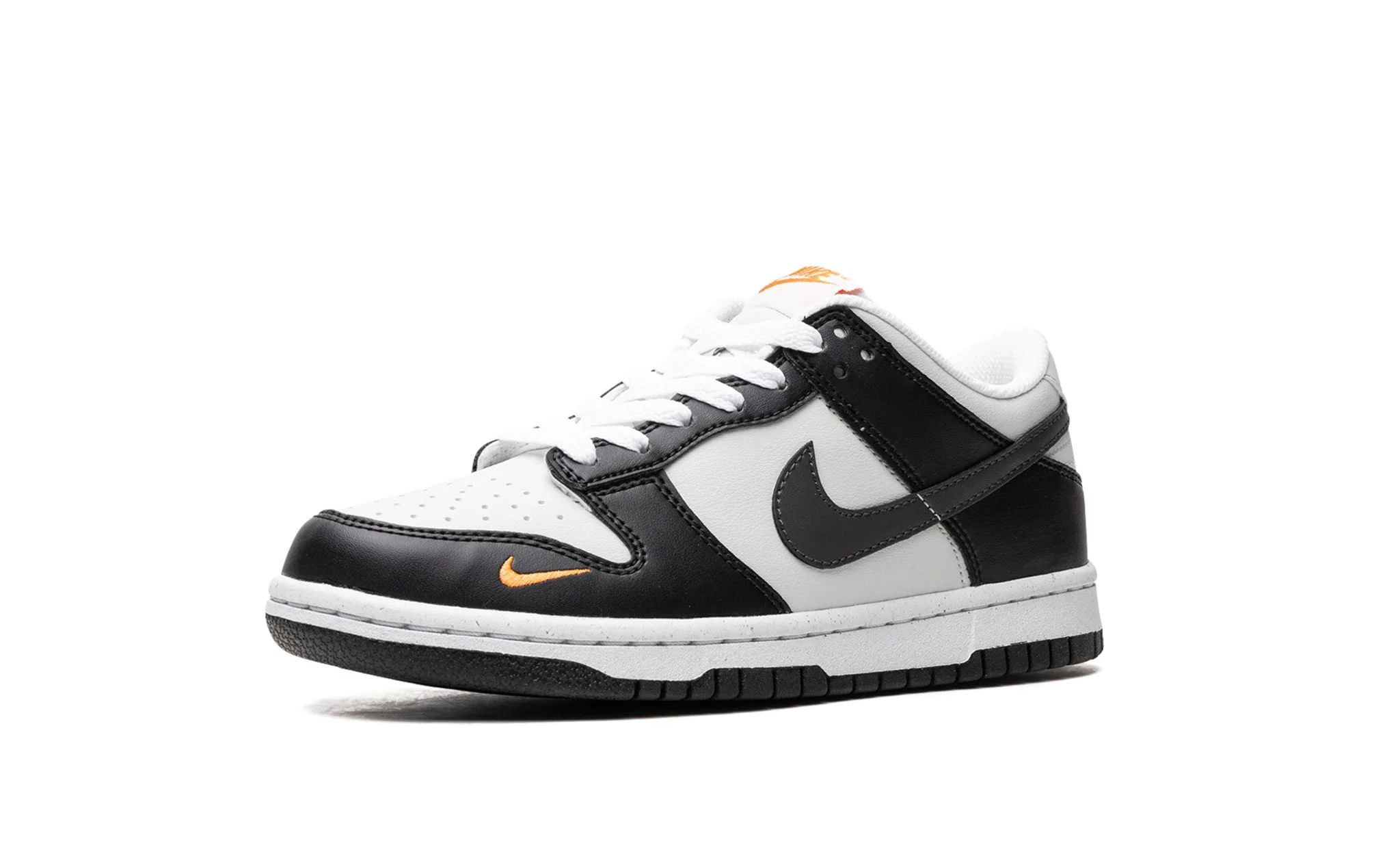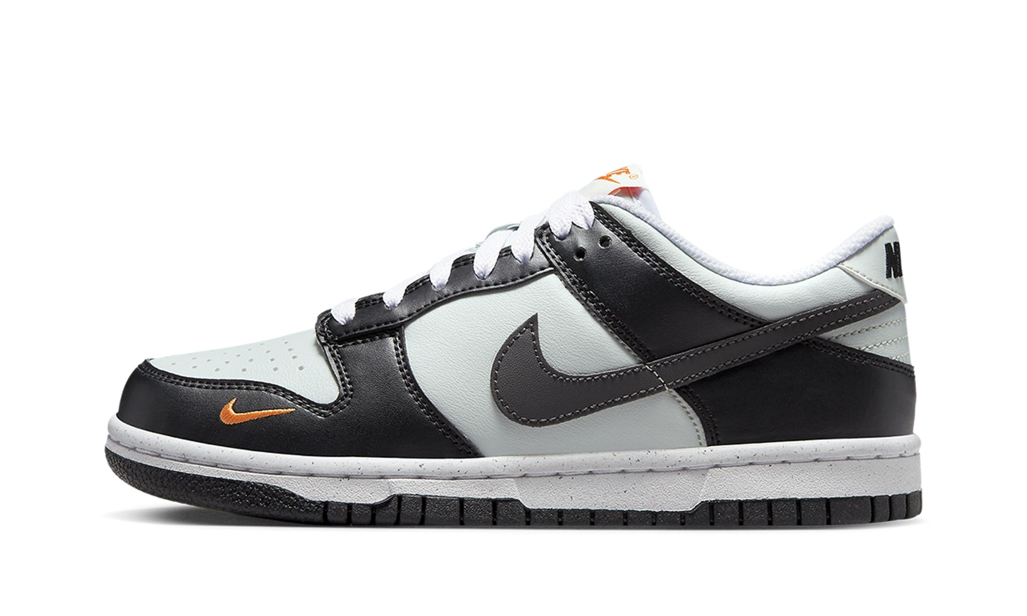 The Nk Dnk Low Next Nature GS "Black/Bright Mandrin" is the youth sizing of the retro basketball shoe made from sustainable materials in an appealing and versatile colorway. The shoe is complete with a Light Silver leather base that’s contrasted with black leather overlays. A black leather appears on the sides and a small Bright Mandrin is embroidered on the forefoot. The orange hue is also found on the Nk logo on the tongue tag. Underfoot, Nk matches the white rubber midsole with a black outsole made with its recycled Nk Grind material to complete the look.