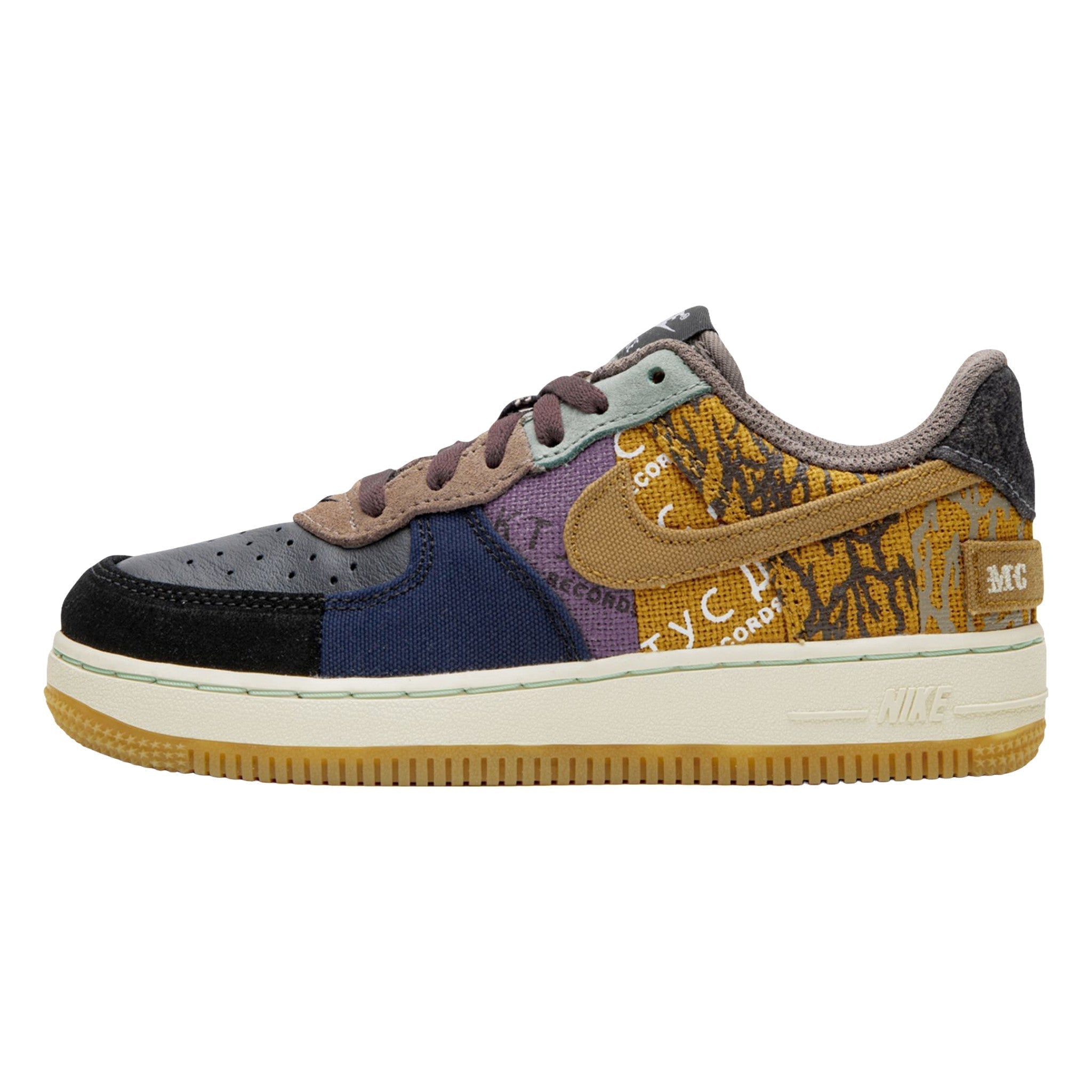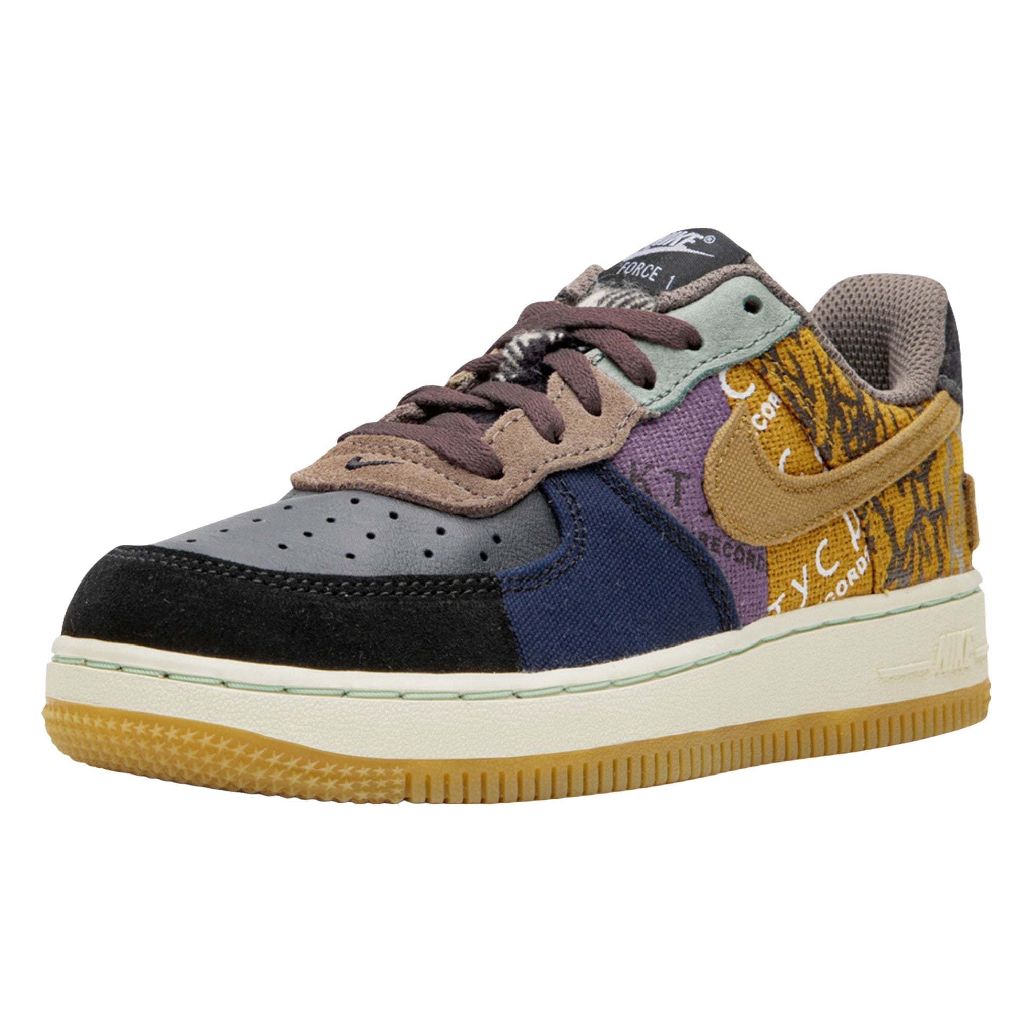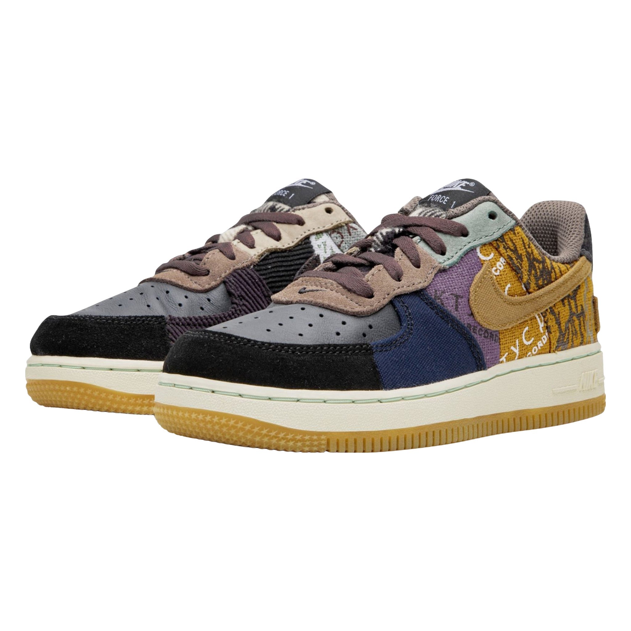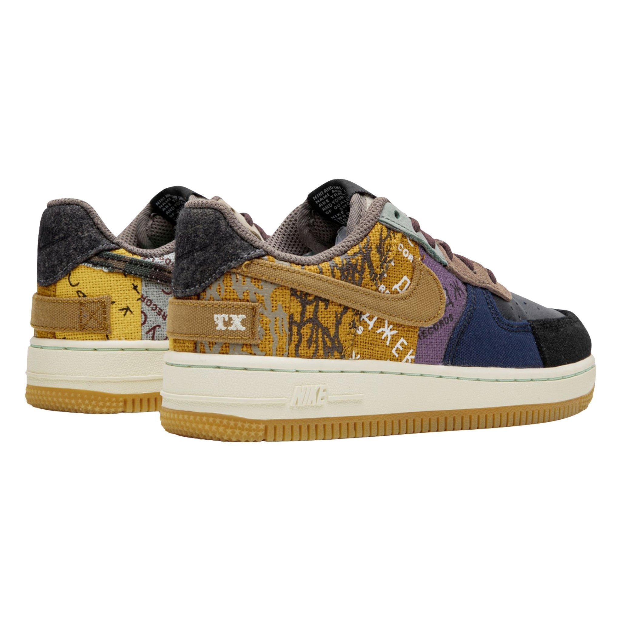 The Trvis Sctt x  PS “Cacts Jak” is the preschool version of the hip hop star’s collaborative Nke shoe released in late 2019. Though shrunken down in size, the aesthetic is the same as its adult-sized counterpart, sans the overlaid lace shroud. The upper features mismatching materials and patterns. A black leather toe is contrasted by black suede around the toe cap and durable navy canvas on the forefoot. Sctt’s record label, “Cacts Jak Records,” is printed onto the purple and harvest gold canvs mid-panel. Tonal embroidered branding matches the “Missouri City” and “Texas” patches embroidered onto the heels of each shoe.