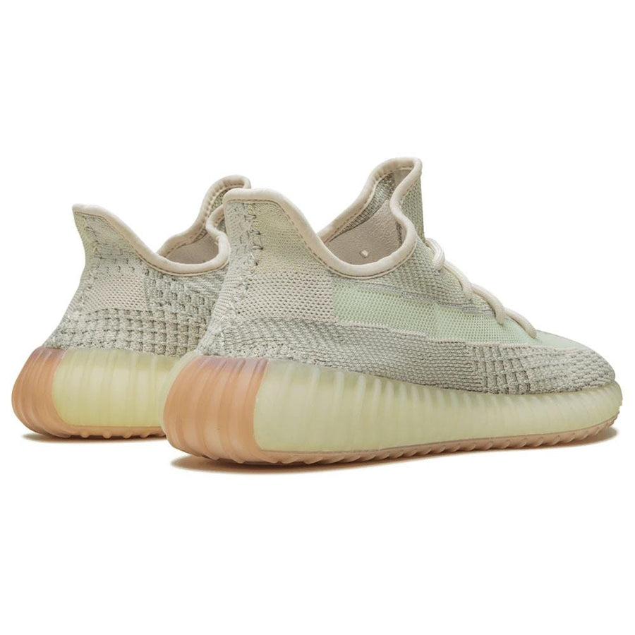 The Yzy Bst 350 V2 “Citrin” is a September 2019 release of the popular Yeezy model. Reminiscent of two prior 350 V2 releases, the “Lundmark” and “Sesame” designs, the “Citrin” edition is built with the same intricate Primeknit weave with transparent side stripes, but this time features tan and pale yellow tints. The citrus-like yellow hue is also found on the monofilament side stripes, as well as the translucent rubber midsole. The outsole receives a reddish tint to the translucent gum rubber to complete the colorway. The “Citrin” design omits the heel tab found on most Yzy 350 V2 releases.