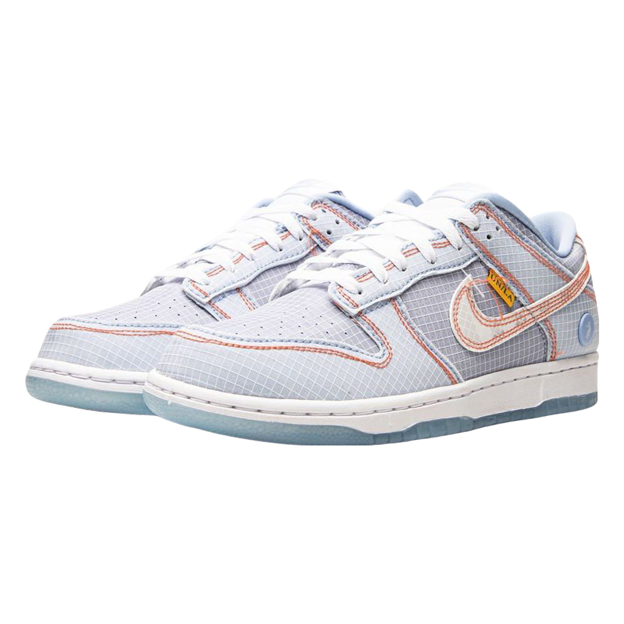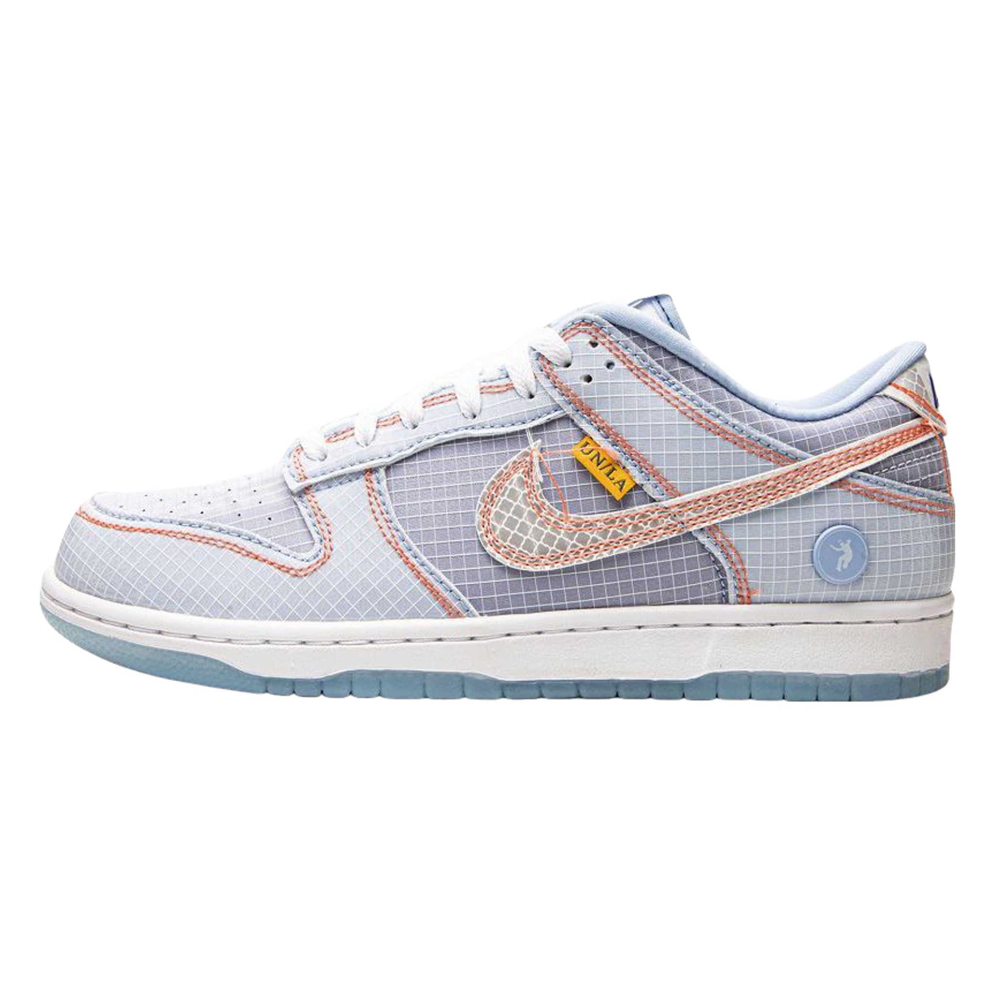 The Union x Nke Dnk Low “Hyper Royal” is a collaboration between Chris Gibbs’s Los Angeles fashion boutique and Nke on the vintage basketball shoe. Perhaps best known for its Ar Jrdan collaborations since the 2010s, Union LA—or just Union for short—is a longtime partner of Nke, having worked with the brand in various instances dating back to the early 2000s. Here, the “Hyper Royal” is one of three colorways of the Dnk from Union’s 2022 collaboration with Nke. The shoe features a gridded, ripstop-nylon-like material on its light blue upper. Each overlay is outlined in orange. A small yellow “UN/LA” hang tag appears on the lateral side of the midfoot overlay and the brand’s “Halo” skateboarding logo is found on the heel and the forefoot of the outsole. The shoe features additional hang tags that allude to baggage claim tags. Underfoot, a white rubber midsole is paired with an icy, semi-translucent outsole.