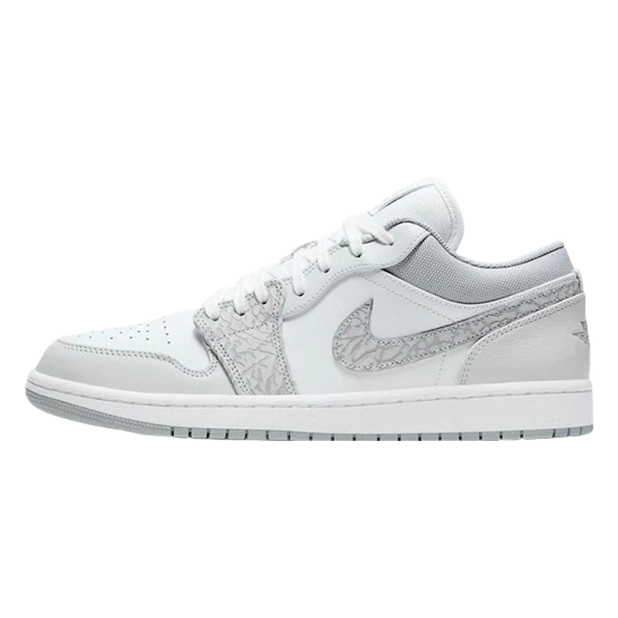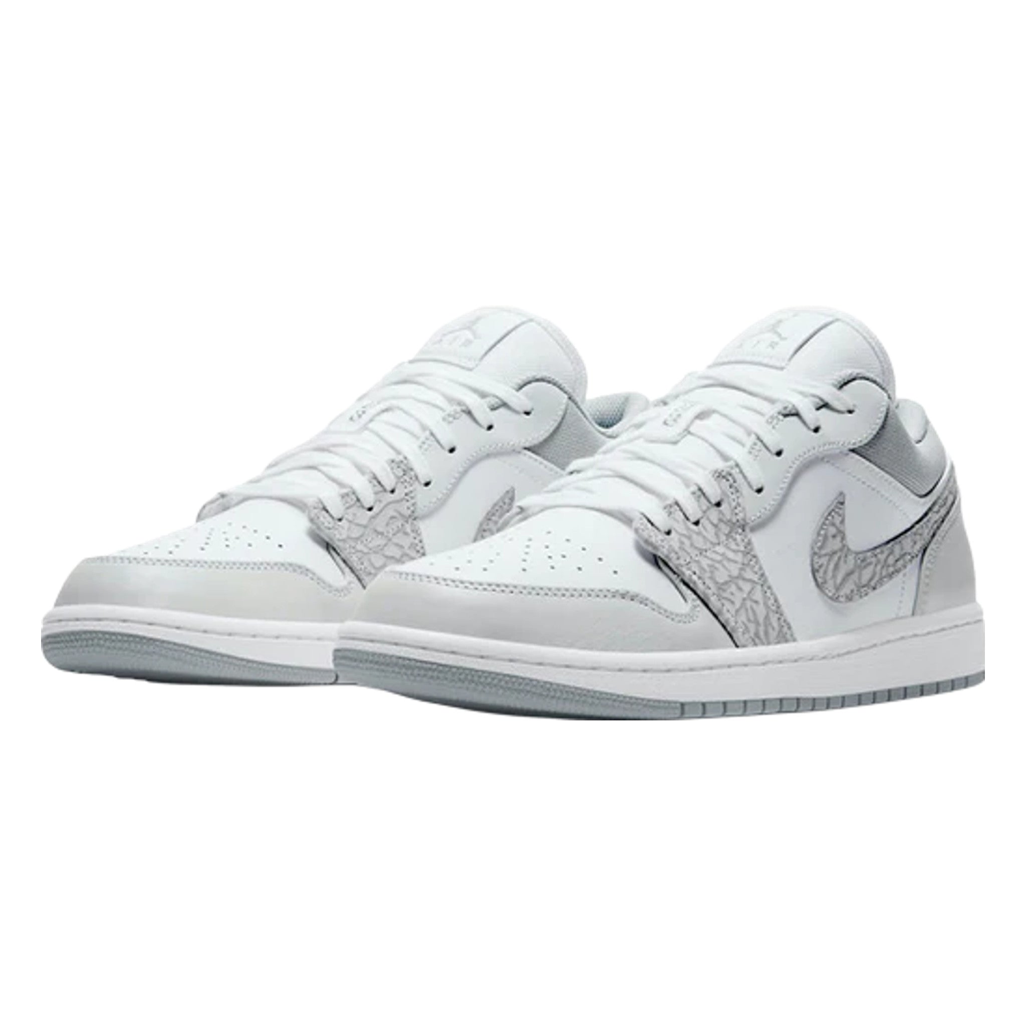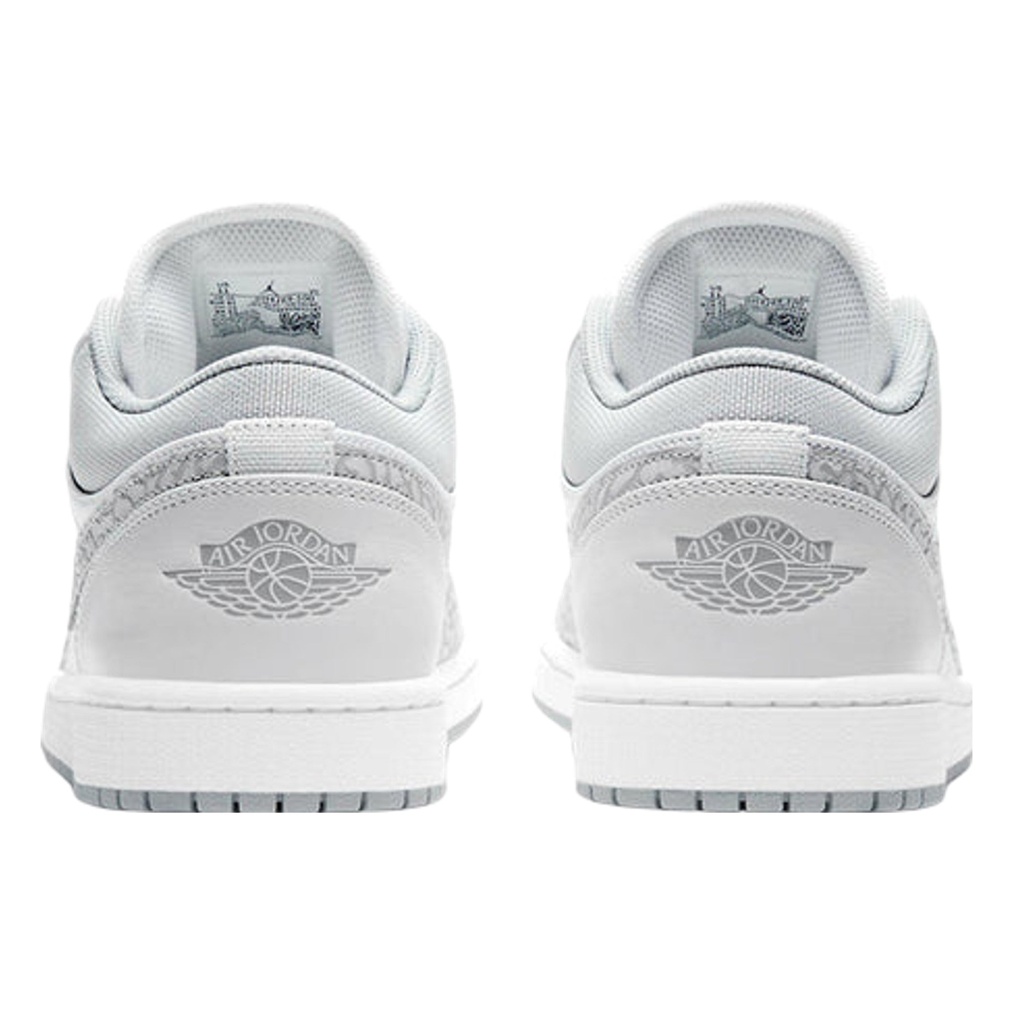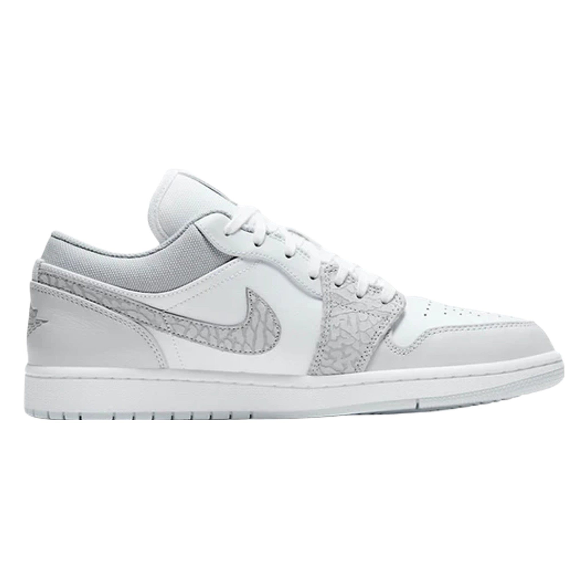 The Ar Jrdn 1 Low “White Camo” is a versatile and desirable low-top version of Michael Jrdn’s signature shoe with a subtle camouflage pattern. This refined look for the Jrdn 1 Low features light grey tumbled leather overlays on the forefoot and eyelets. Contrasting white perforated leather appears on the toe and a smooth variant of the material covers the mid-panel. Branding, like the “White Camo” leather located on either side, as well as the mini black embroidery the tongue and “Wngs” emblem on the heel, add classic styling to the Ar Jrdn 1.
