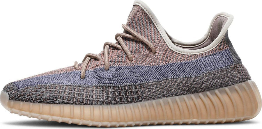 The Yzy 350 V2 Fade features a marbled brown Primeknit upper with a deep blue side stripe across the quarter. A tan translucent midsole around a gum Boost interior completes this standard Yzy design.