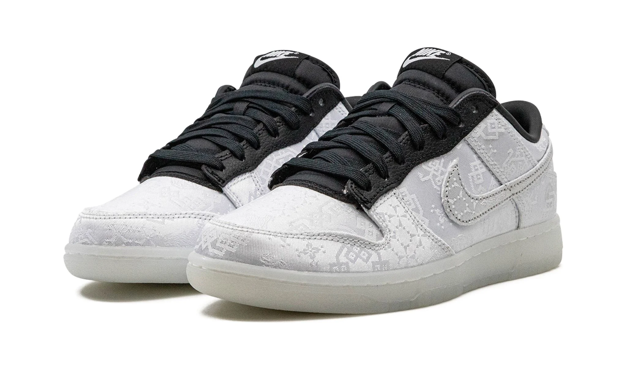 The Frgment x Clot x Nke Dnk Low “White/Black” is a three-way collaboration between Hiroshi Fujiwara and Edison Chen’s clothing brands and Nke on a colorway of the vintage basketball shoe with a tear-away design. Fujiwara’s Frgment Design and Chen’s Clot clothing brands team up to give the Dnk Low one of its most unique colorways yet on the “White/Black.” The shoe features a silky white fabric across the upper that can be worn away or cut off to reveal a hidden pattern underneath. Contrasting the look are black leather eyelets, a black nylon tongue, and black inner lining. “Clot” and “FRGMT” branding are embroidered on the back of the left and right shoe, respectively.