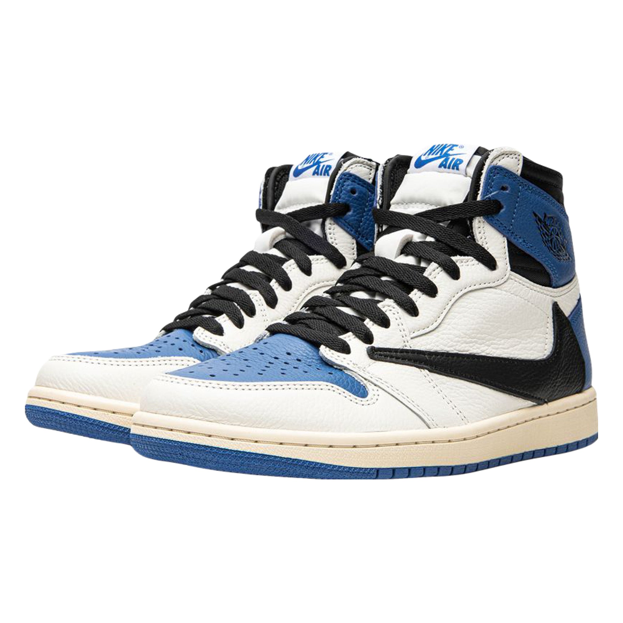 The Trvis Sctt x Frgment x Ar Jrdn 1 High OG “Military Blue” is a three way collaboration between the Houston rapper, the Japanese streetwear outfit, and Jrdn Brand on Michael Jrdn's first signature shoe. Released alongside an Ar Jrdn 1 Low, the Travis Sctt and Hiroshi Fujiwara-designed high-top Jrdn 1 “Military Blue” combines the distinct aesthetics of both Scott and Fujiwara on the iconic retro basketball shoe. Supple Military Blue leather appears on the perforated toe and on the collar and heel. Contrasting white tumbled leather is located on the toe cap, forefoot, eyelets, and mid-panel. The oversized backwards black leather Swoosh is a call back to the styling of the hip-hop star’s first Ar Jrdn 1 collaboration from 2019. A black “Wngs” logo resides on the collar. Industrial-style branding, as seen on frgment’s collaborations with Nk and Jrdn Brand in the past, appears in black text on the medial side of the cream rubber midsole. Dual “Cactus Jack” and Frgment insignia can be found on the back of the left and right shoe, respectively. The Trvis Sctt x Frgment x Ar Jrdn 1 Hgh OG “Military Blue” is one of the most desirable sneaker releases of 2021.