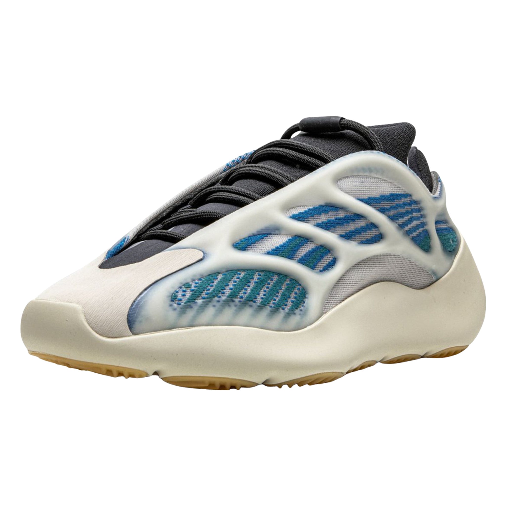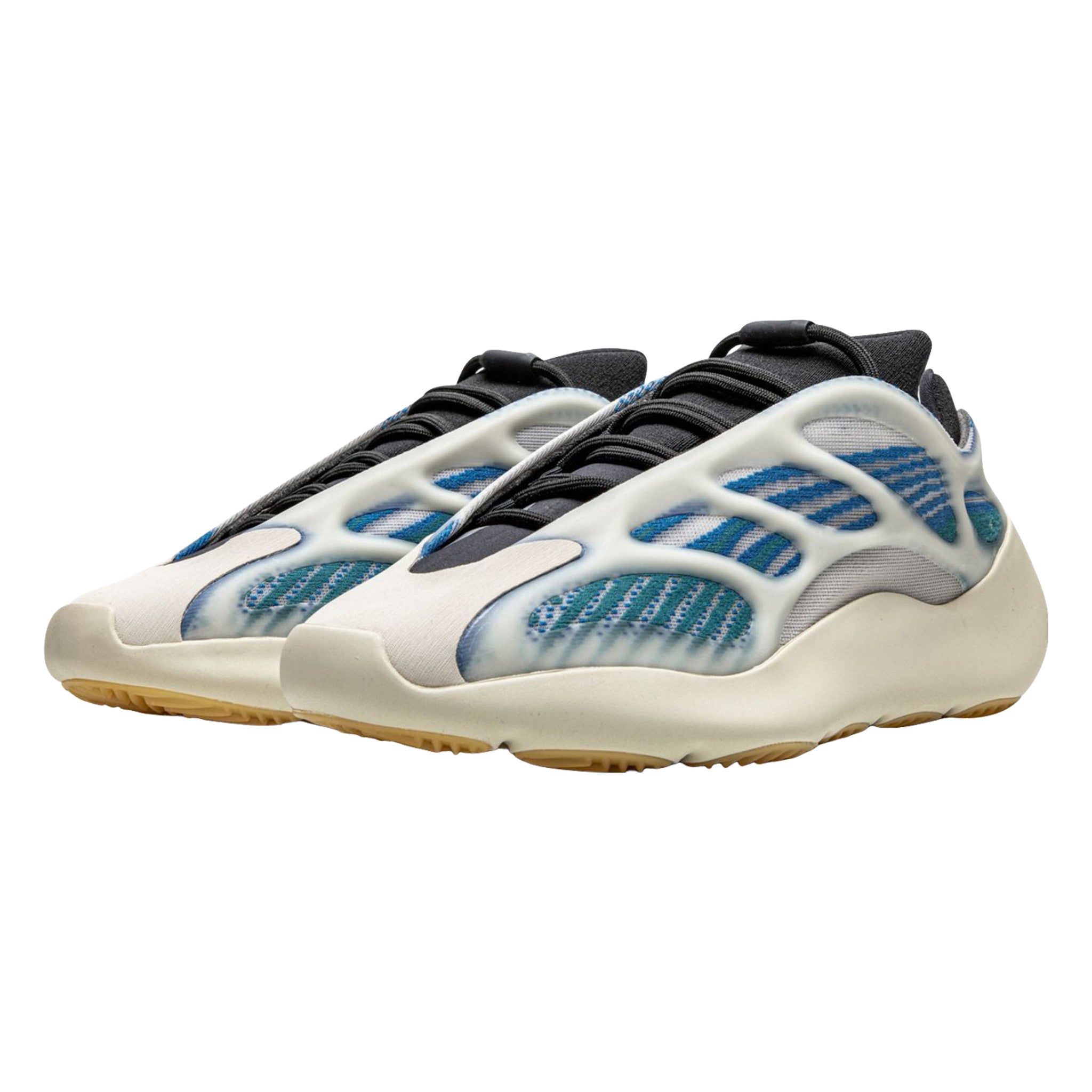 The Yzy Boost 700 V3 “Kyanite” is a March 2021 colorway of Kanye West’s evolutionary low-top silhouette. Comparing favorably to the “Azareth” colorway of the same model, the “Kyanite” also displays blue streaks in its intricately knitted upper that contrast the white fabric and the semi-translucent, glow-in-the-dark RPU overlays. Like all 700 V3s, the “Kyanite” features an EVA foam midsole that replaces the Bst cushioned version found on early iterations of the Yzy 700 model. The aforementioned RPU cage has been added to the model for stability. A neoprene bootie-like collar provides additional support to the wearer.