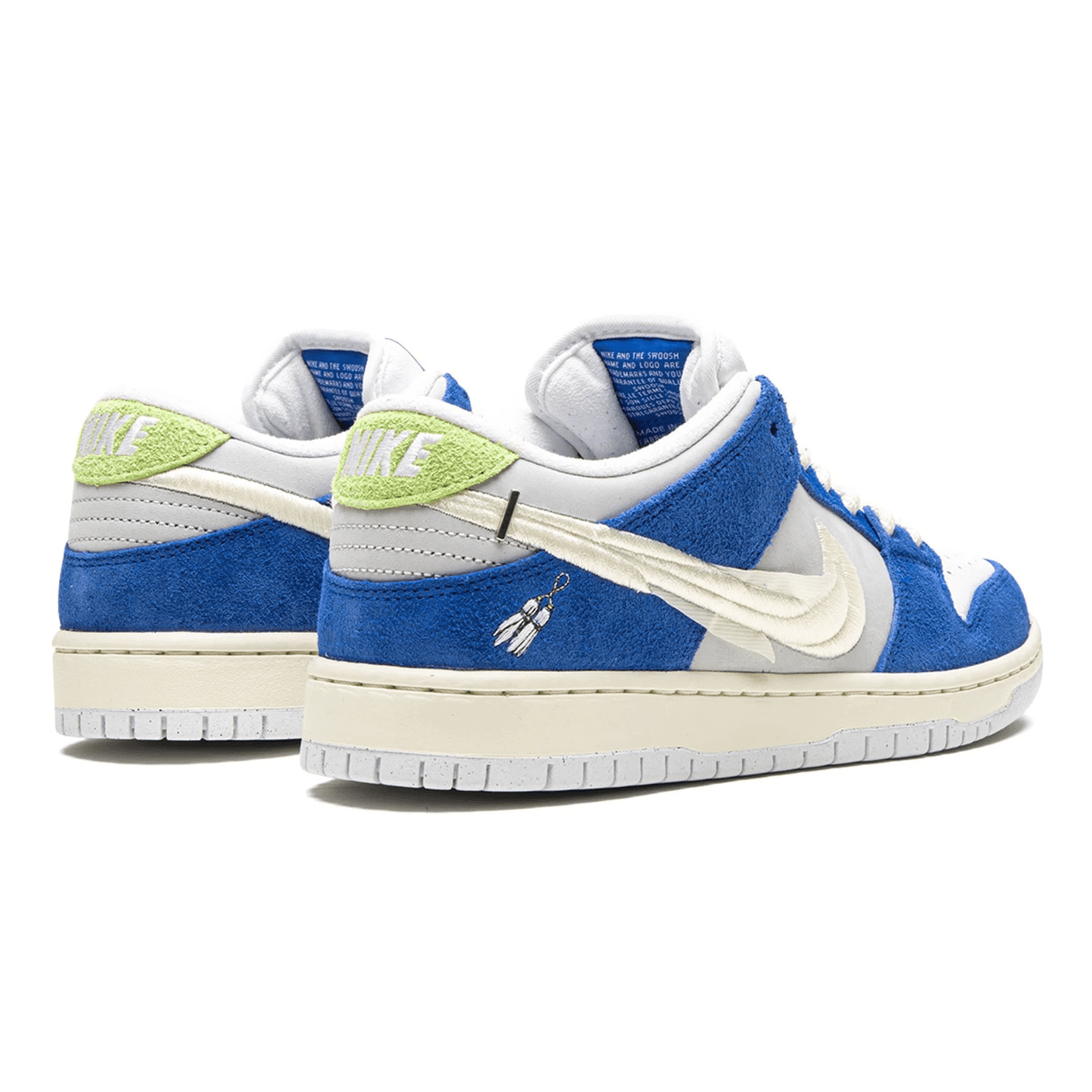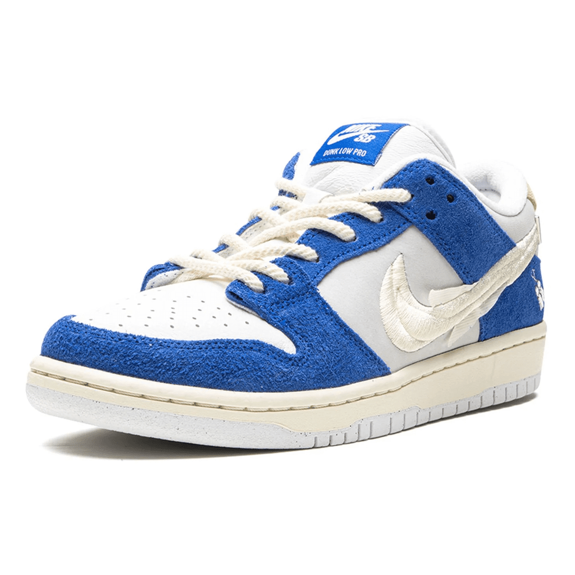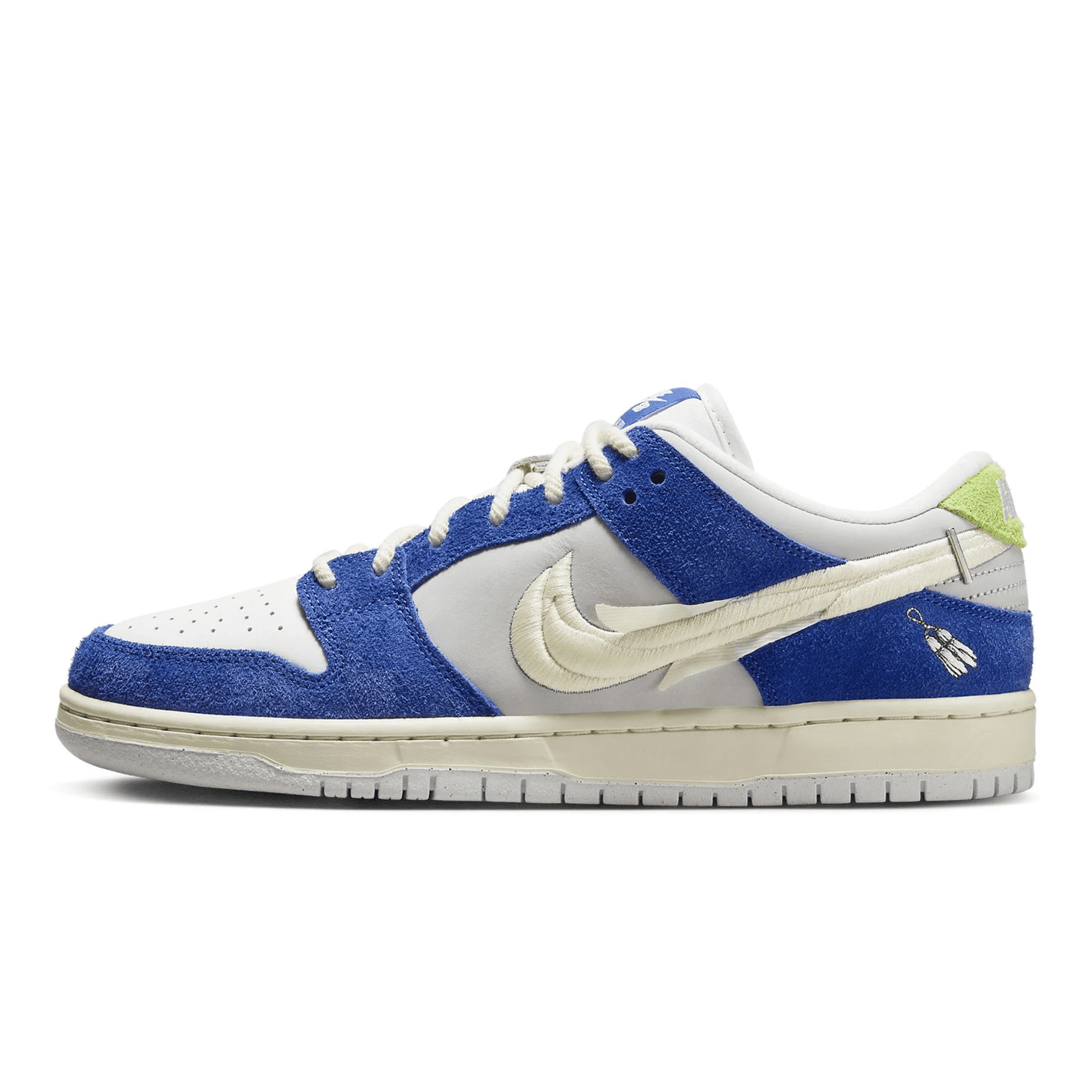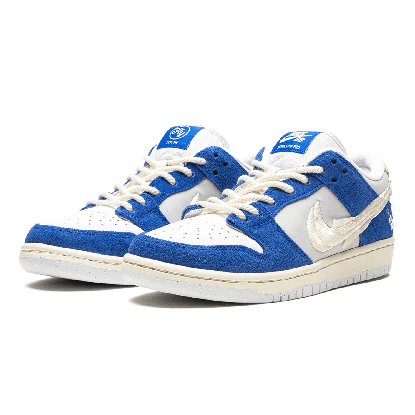 Nk x Fly Streetwear SB Dnk Low "Gardenia" sneakers. Designed in collaboration with Fly Streetwear founder Jeff Han, the Nke SB Dnk Low "Gardenia" are inspired by the fragrant gardenia flowers sold on the streets of Shanghai. This pair has a royal blue, light grey and white colourway and features a classic silhouette enhanced with embroidered graphics that remember sweet-scented bouquets and one of Jeff's earliest memories - skating through the perfumed city.