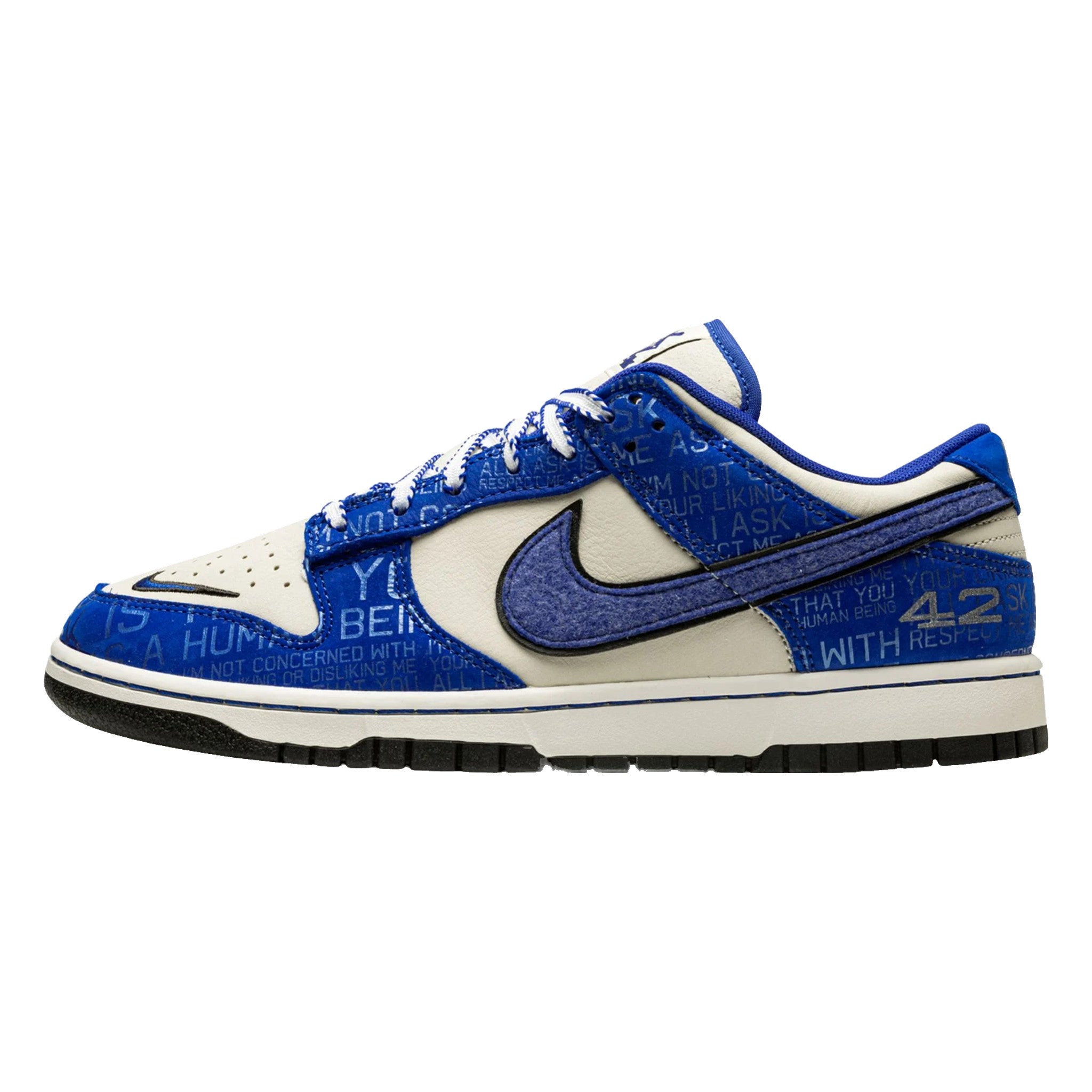 The Nke Dnk Low “Jackie Robinson” is a special edition colorway that honors the life and legacy of the civil rights activist and Baseball Hall of Famer. From Nke’s July 2022 release cycle, the “Jackie Robinson” Dnk Low celebrates Jackie Robinson, who broke baseball’s color barrier in 1948. The colorway takes inspiration from Jackie’s time with the Brooklyn Dodgers, beginning with Racer Blue leather overlays on the toe cap, forefoot, eyelets, collar, heel, all of which are inscribed with inspirational quotes by Jackie. The leather base appears in a cream-grey hue. Together, the two colors are inspired by the Brooklyn Dodgers’ old team uniform colors. Other overtures to Jackie’s time on the ballclub include his “42” jersey number on the heel. A commemorative “75th anniversary” patch appears on the tongue as a salute to Jackie’s arrival in Major League Baseball in ‘48.