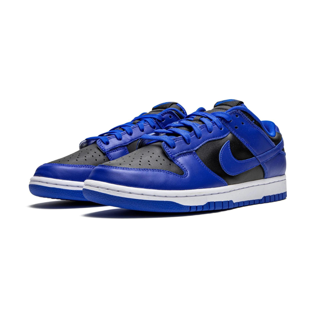 The Nk Dnk Low “Hyper Cobalt” is a February 2021 release of the all-time classic silhouette that is inspired by an original Ar Jrdn colorway. The black and Hyper Cobalt leather panels on this Dnk are based loosely around the design of the “Royal” Jrdn 1, a popular shoe that first appeared in 1985. Like the “Royal,” black leather appears on the perforated toe and on the mid-panel, collar, and heel of the “Hyper Cobalt.” Blue leather overlays on the forefoot, eyelets, collar, and heel pop against the neutral base. A Hyper Cobalt leather appears on either side of the shoe and black “Nk” embroidery is stitched onto the heel. Blue “Nk” detailing appears on the branding tag on the black nylon tongue.
