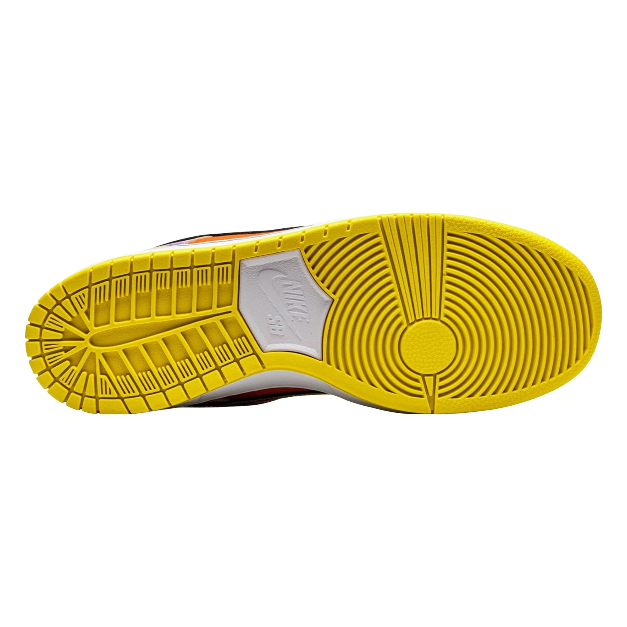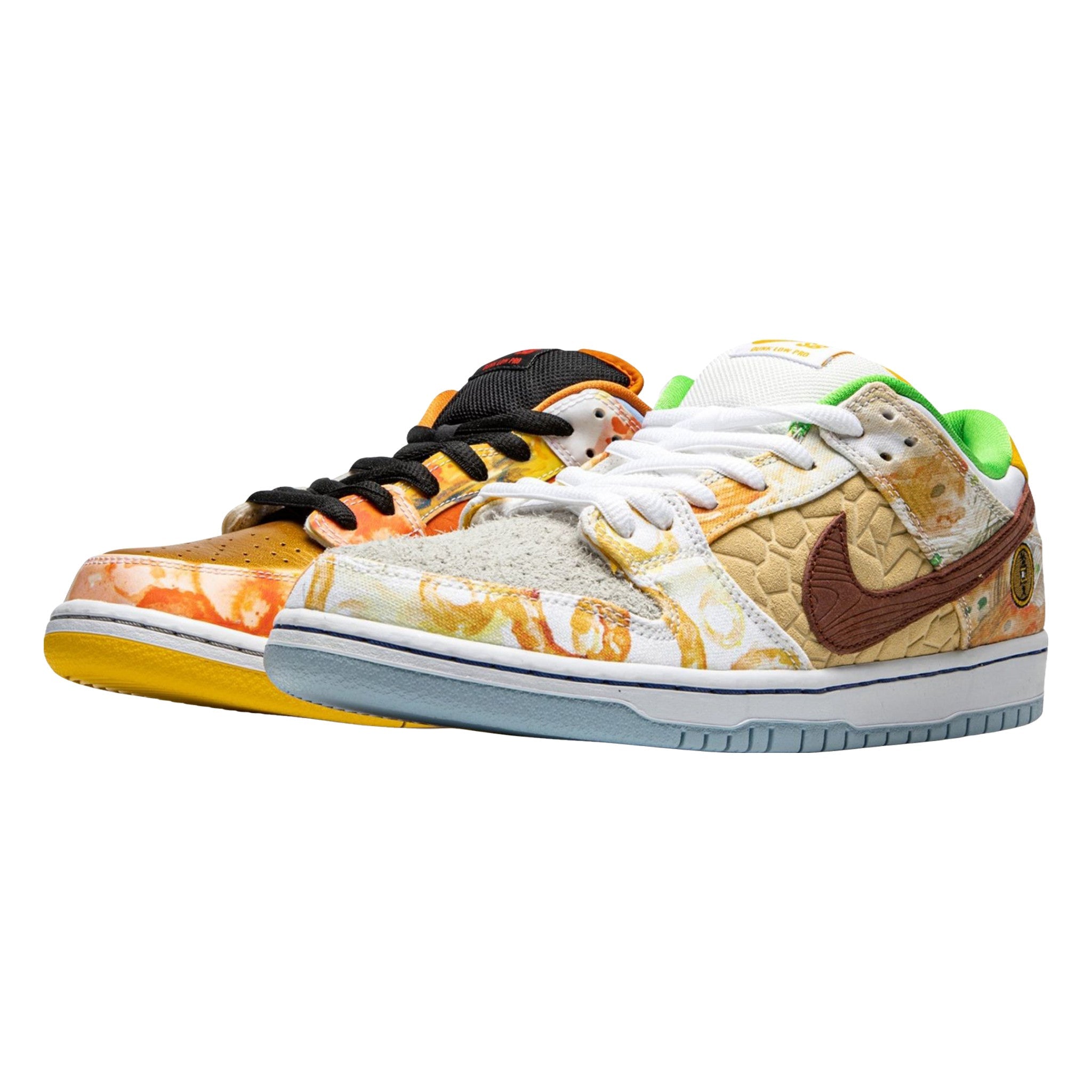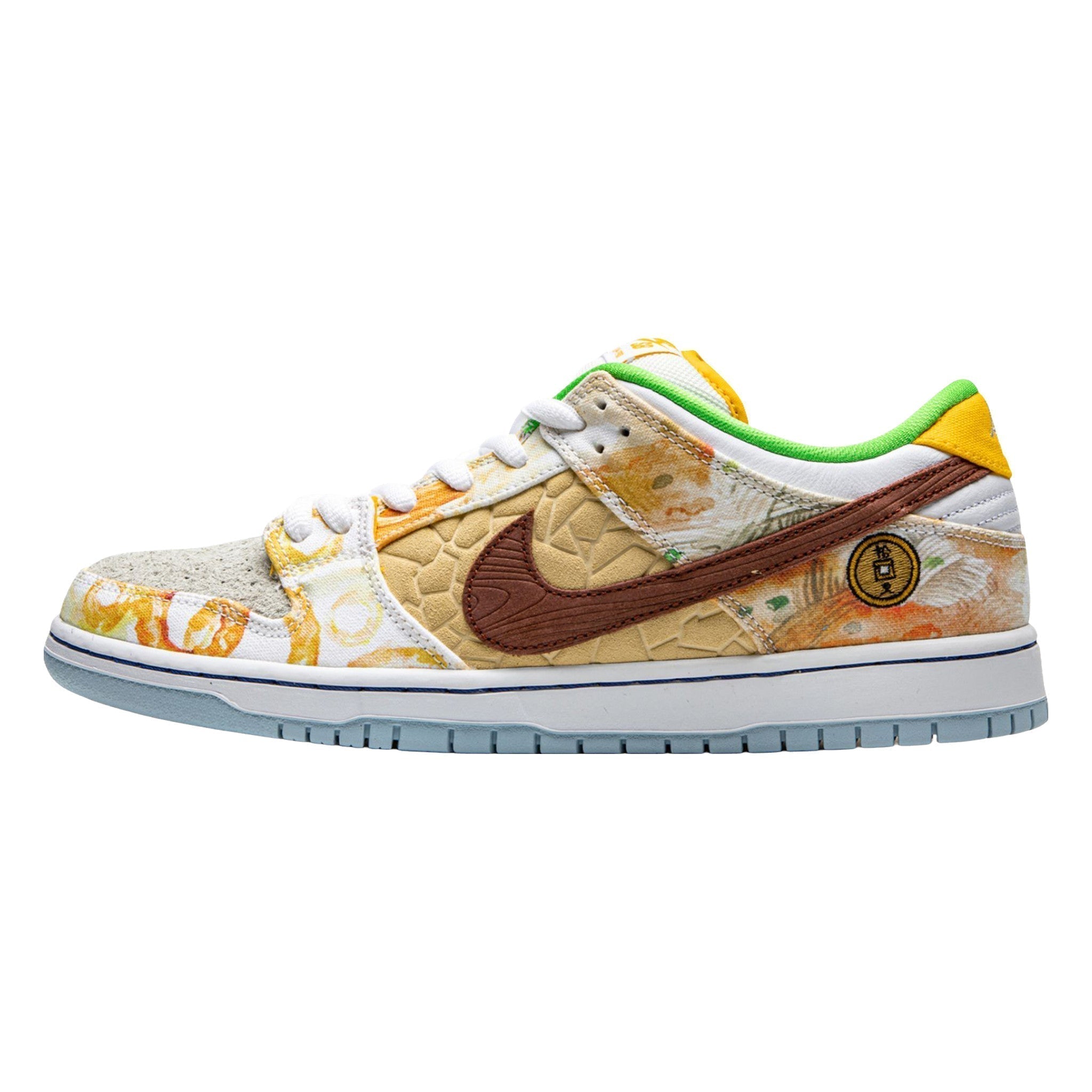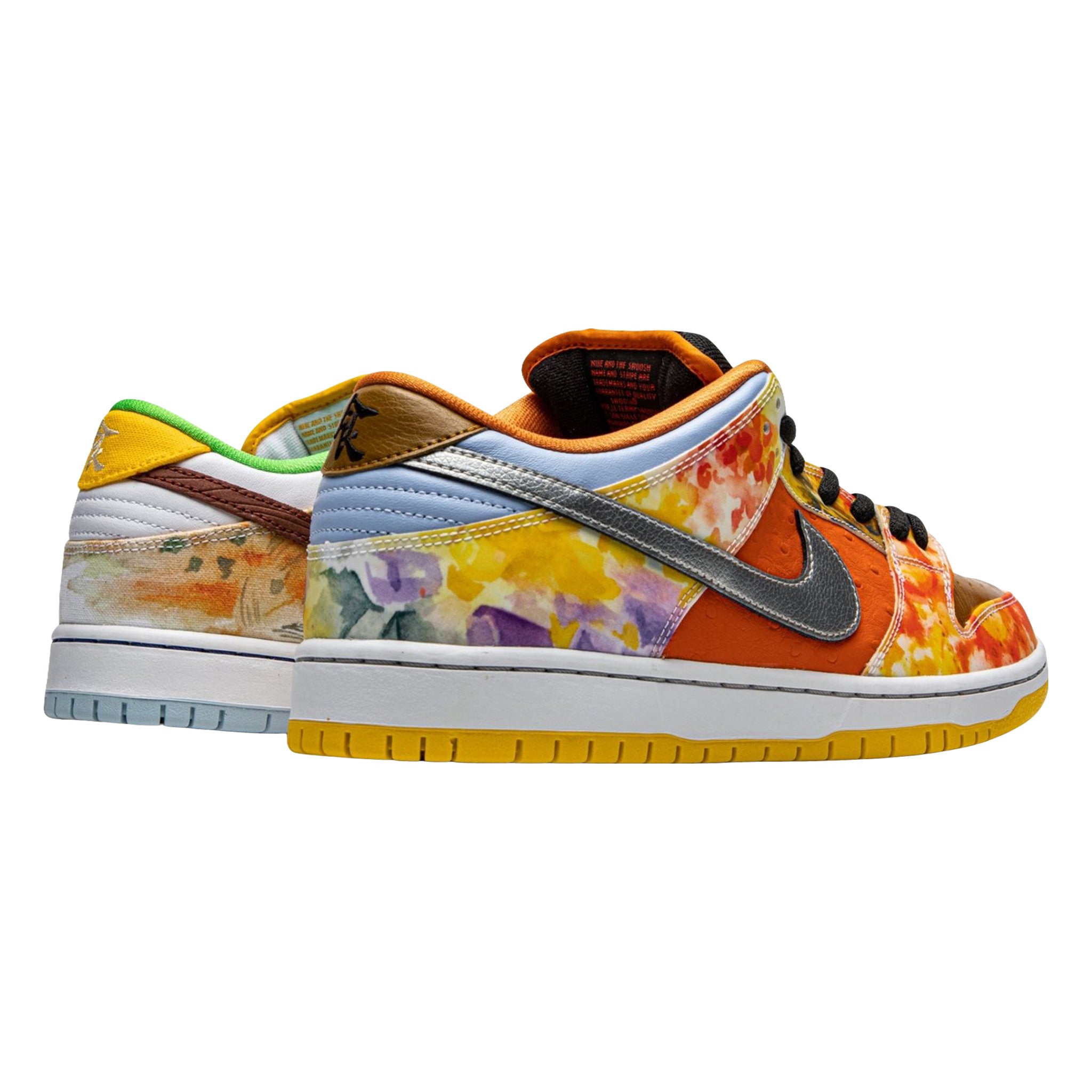 The Nke Sb Dnk Low Pro “Street Hawker” is a January 2021 release by Nke’s skateboarding line designed by artist Jason Deng. The “Street Hawker” represents the bonding of cultures across China’s sprawling landscape. Food, in particular, plays an important role in inspiring the creative process behind the “Street Hawker.” Six regional food dishes are referenced in the watercolor paintings on both the left and right shoe. The left shoe displays neutral colored panels beginning with the brown accenting and extending to the toe and mid-panel. The right shoe is more adventurous in design and features orange leather on the mid-panel, a brown toe, and rainbow-like arrangement on watercolors on the overlay panels.