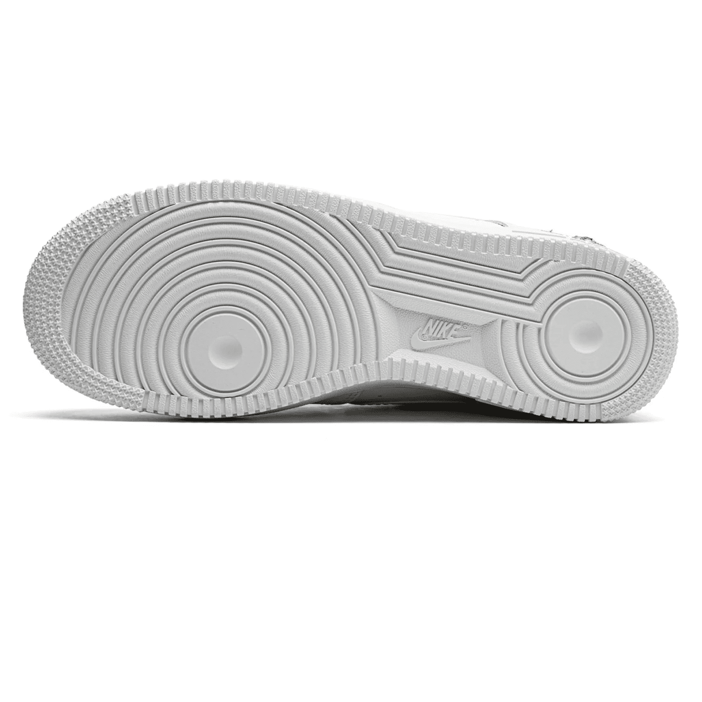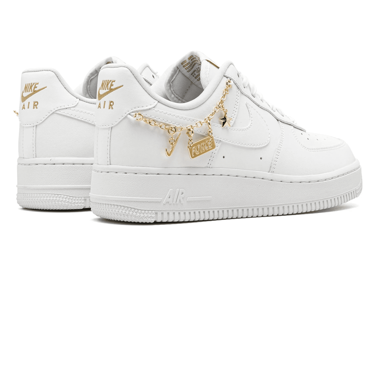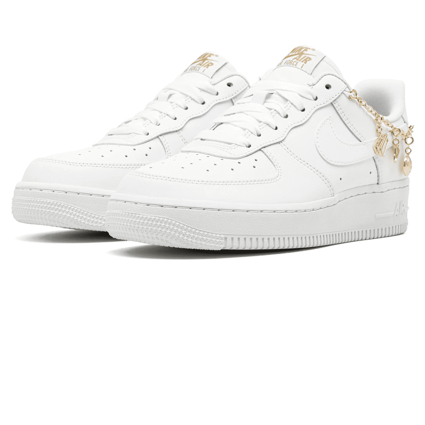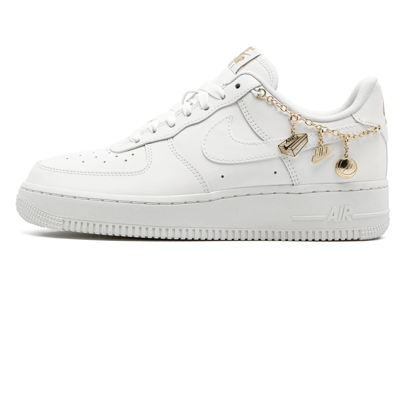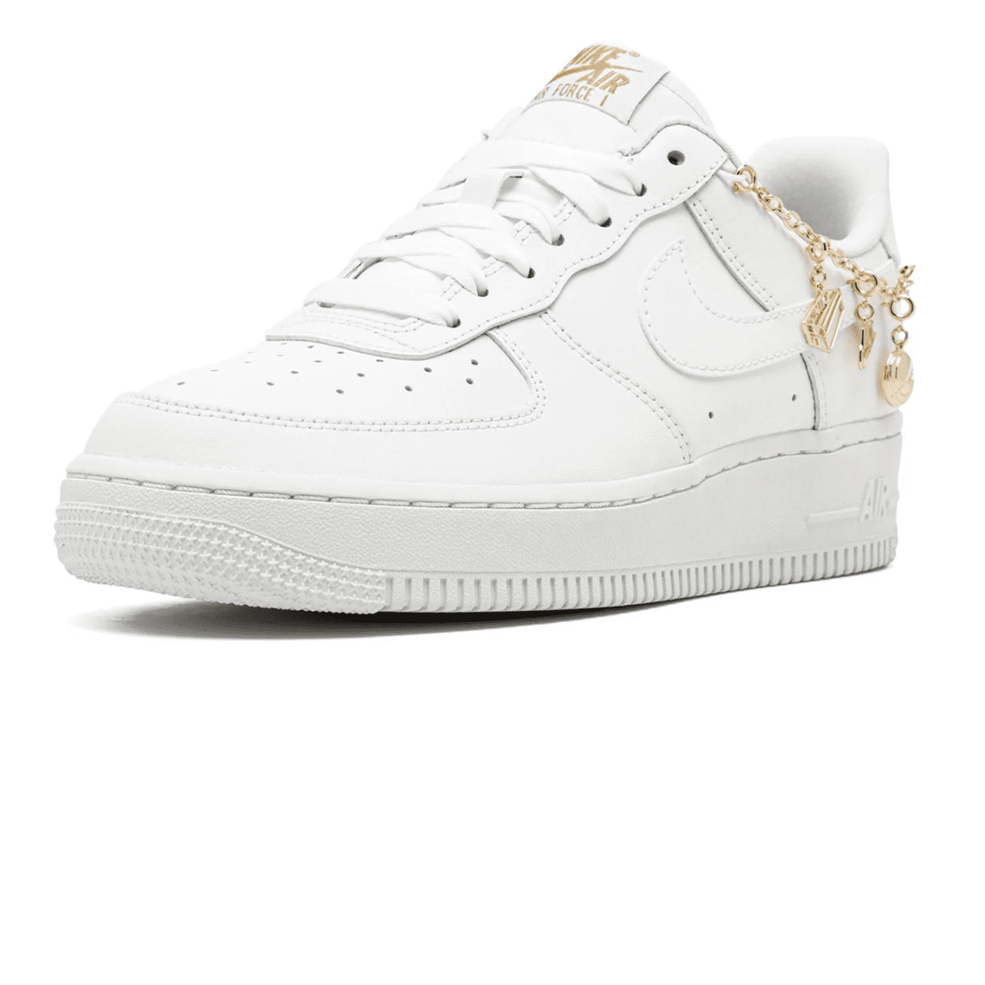 The Women’s Ar Frc 1 Low “Luky Charms” is a women’s version of the retro basketball shoe in a casual, white-based colorway that features added jewelry on its design. The “Luky Chrms” is one of several women’s-exclusive variations of the Ar Frc 1 with flashy jewels on its design, the others being the “Bling” and Ar Frc 1 Shadow “Charms.” On the “Lucky Charms,” the entire upper, including the perforated toe, overlay panels, and branding, are designed in white leather. Contrasting Metallic Gold Ar detailing are embroidered on the heel and printed on the white nylon tongue tag. A Metallic Gold chain with-adjacent charms is found on the collar.