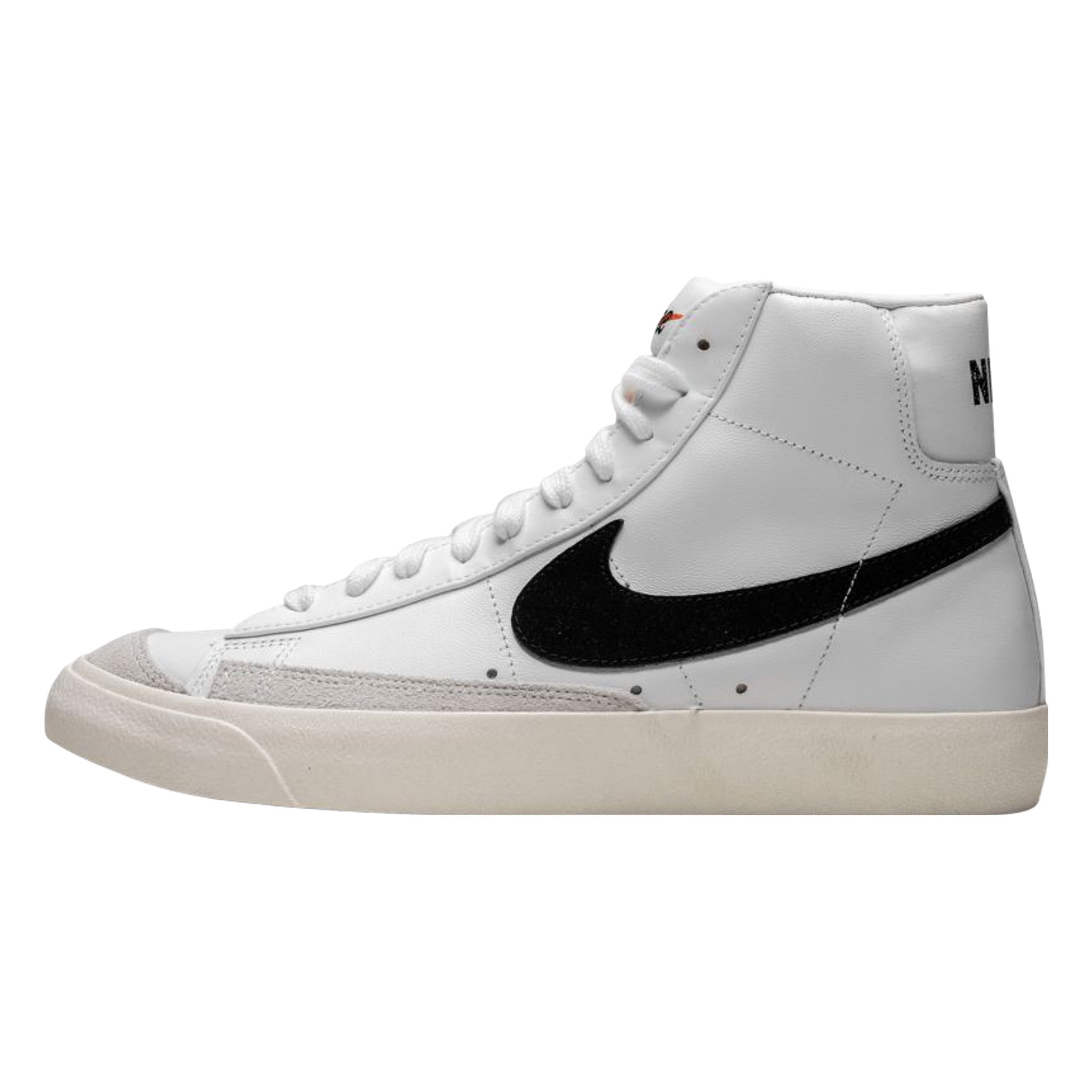 White/black leather Blazer Mid '77 Vintage sneakers from Nke featuring signature logo detail, round toe, front lace-up...