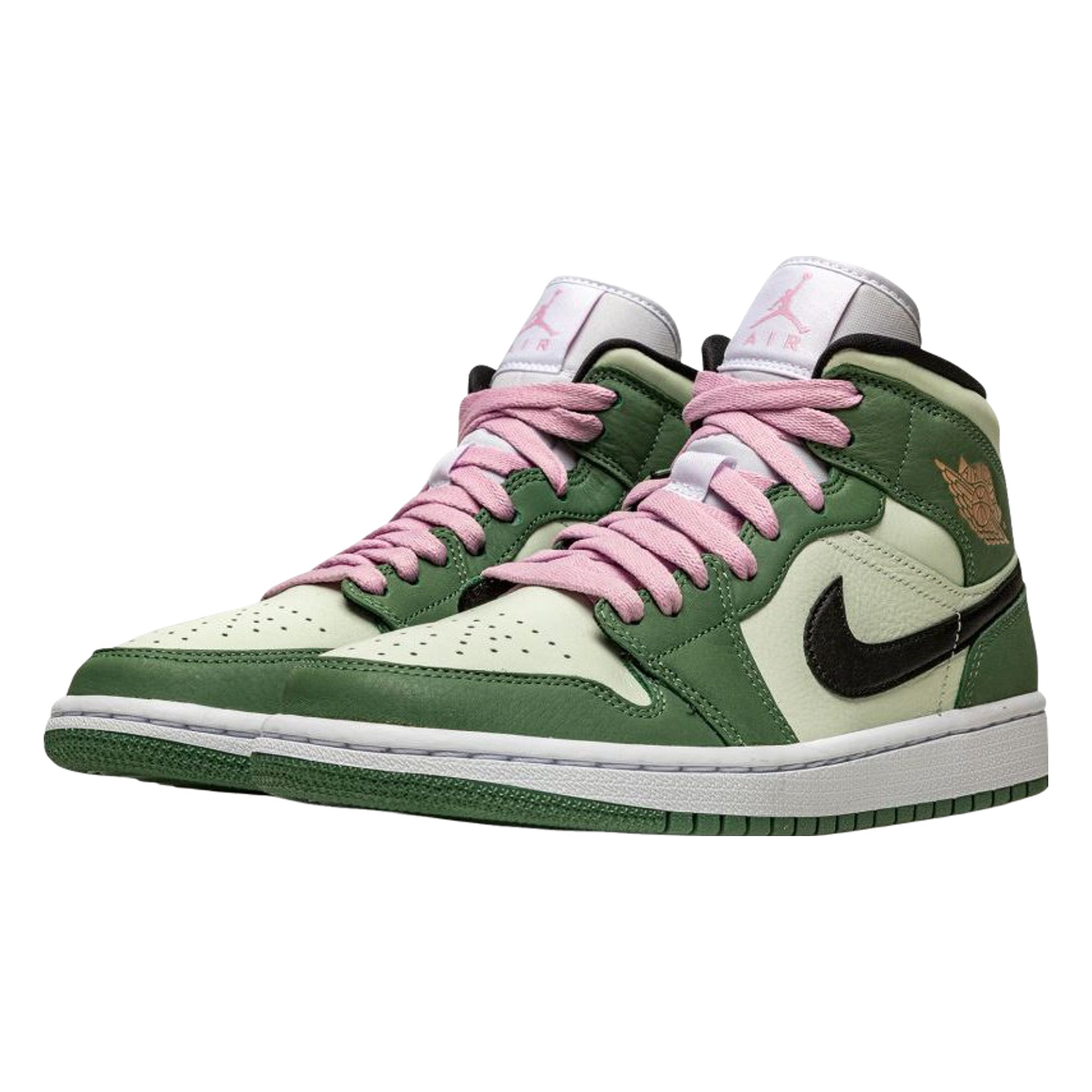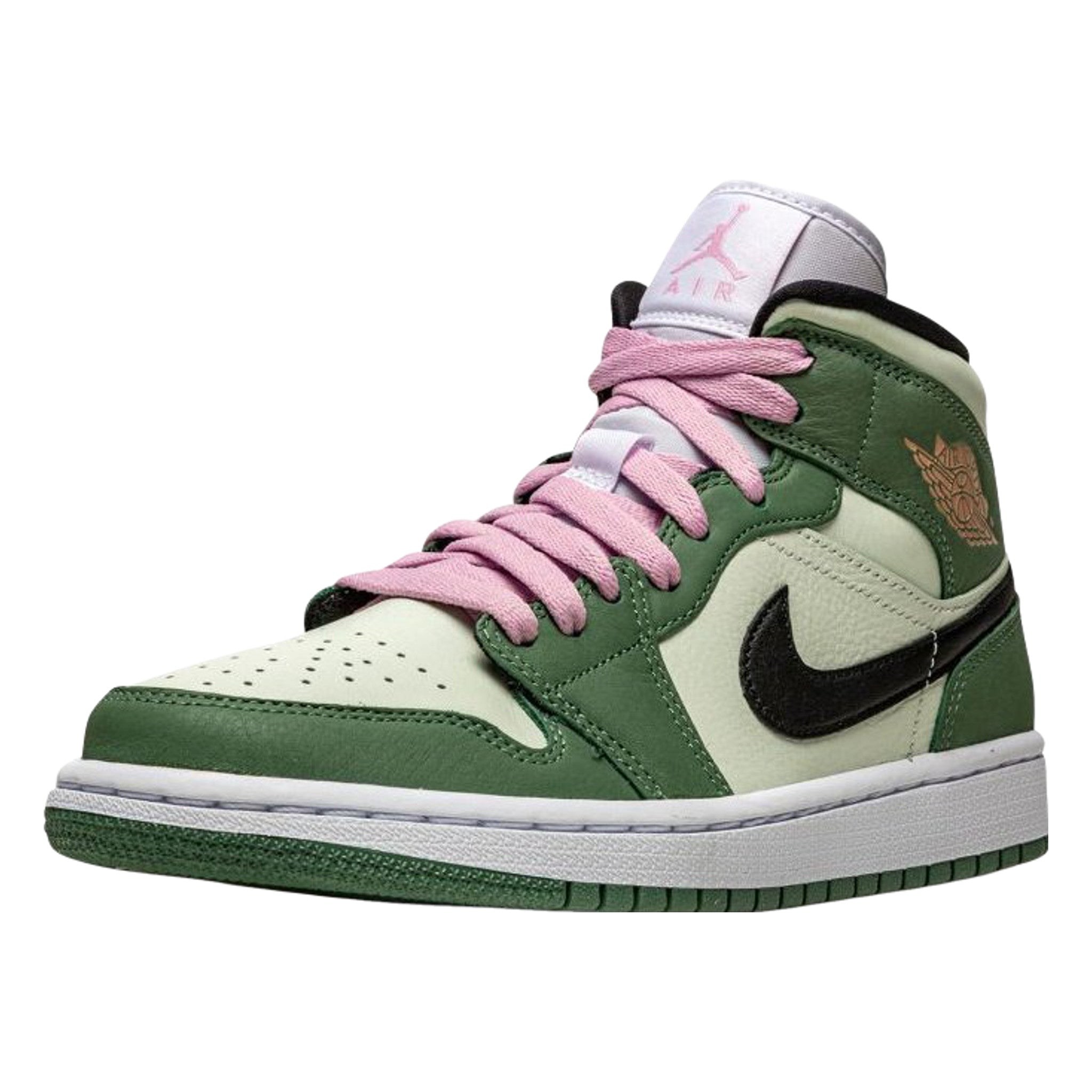 The Women’s Ar Jordn 1 Mid SE “Dutch Green” is a unique look for Michael Jordn’s first signature shoe in women’s sizing. Featuring a distinctly earth tone color palette, the “Dutch Green” has a Barely Green or mint leather on the perforated toe and on the mid-panel and collar. Dutch Green leather detailing appears on the forefoot, eyelets, collar, and heel. A black leather on the mid-panel breaks up the look. A dusty pink “Wings” logo appears on the collar and a pink graces the tag on the white nylon tongue. Interestingly, Jordn Brand opts for pink laces here, a style move that may reference the laces found on Travis Scott’s limited Ar Jordn 1 collaboration from 2019. A white midsole and Dutch Green outsole complete the look.