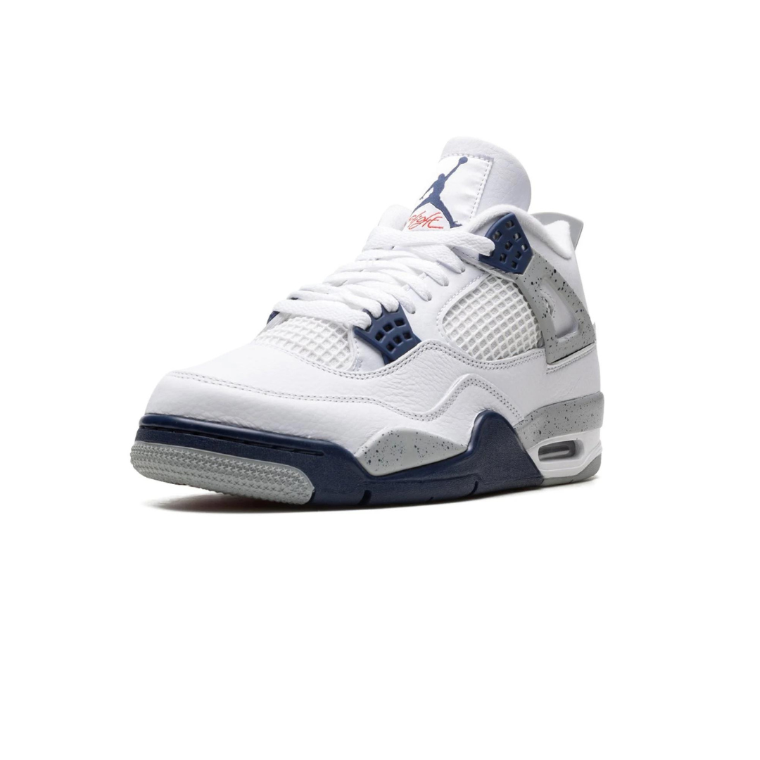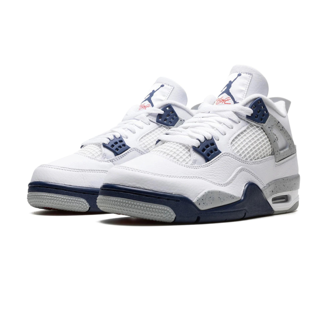 The Ar Jordn 4 “Midnight Navy” is a colorway of Michael Jordn’s fourth signature shoe inspired by the model’s iconic “White Cement” style. The “Midnight Navy” replicates the color scheme of the Jordn 4 “White Cement,” but replaces the shoe’s red accents with navy. The upper is constructed from white leather, save for the tongue and mid-panel which feature tonal mesh detailing. Midnight Navy plastic lace holders are found on the throat and collar. The Jordn 4’s signature “Cement” detailing appears on the “Wngs” tabs, on the mudguard, and on the and “Ar” branded heel counter. A visible Air unit in the heel completes the design.