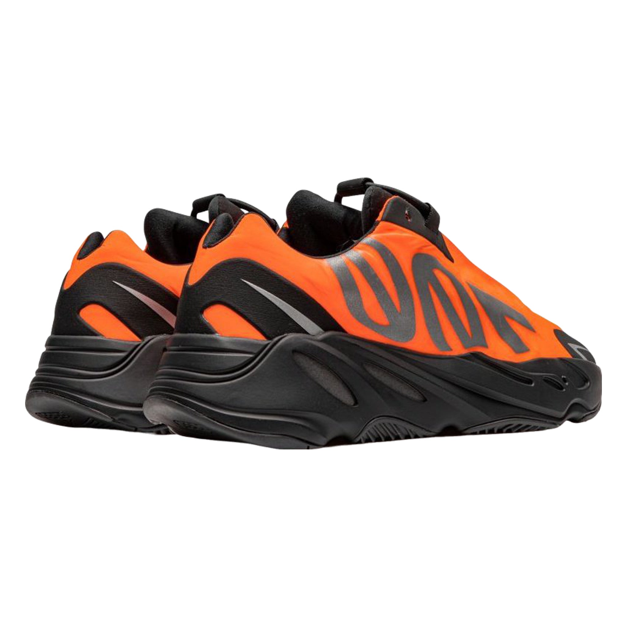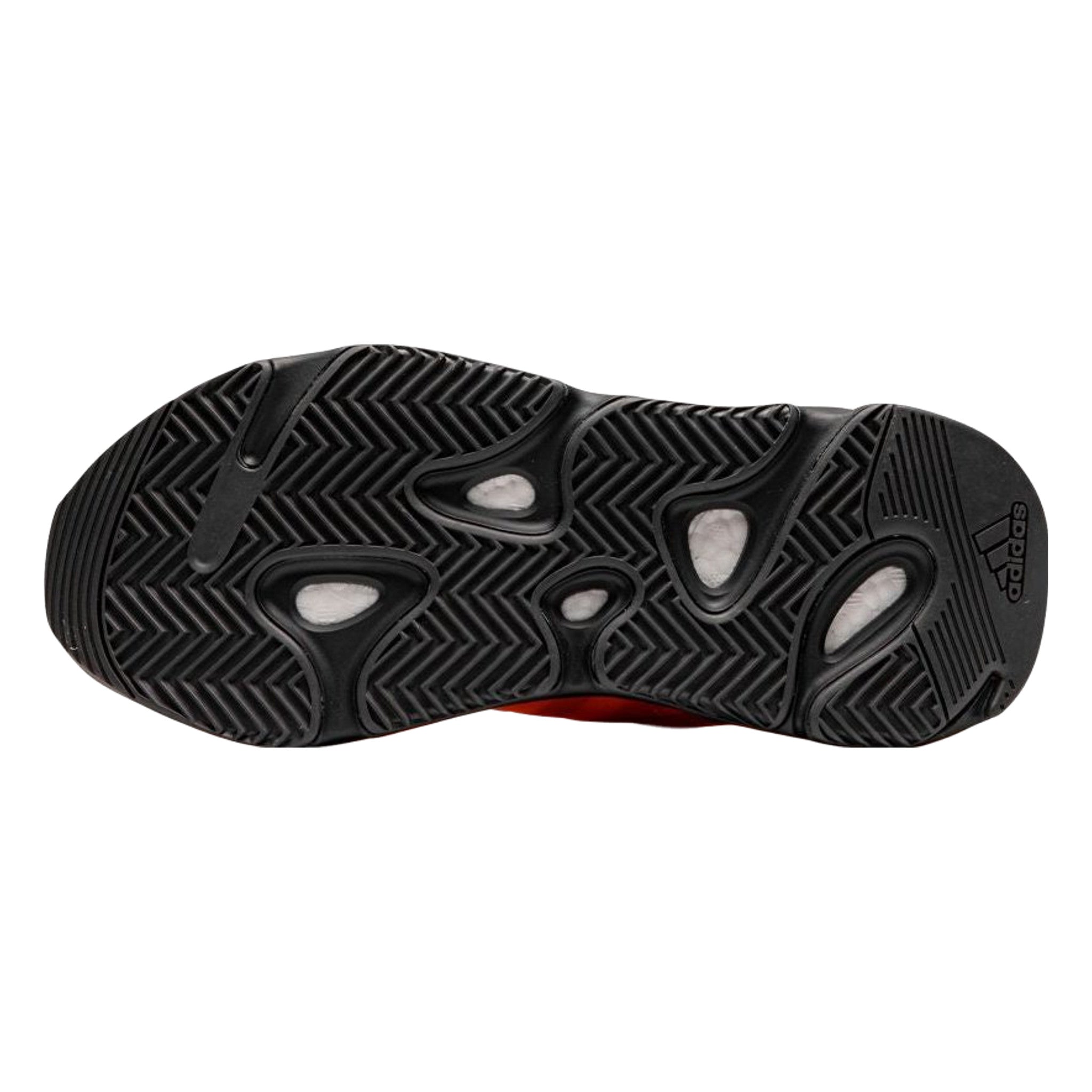 The Yzy Bst 700 MNVN “Orange” is a vivid colorway of Kanye West’s heralded “dad shoe” with adidas. The model’s first form of outward branding is seen on the mid-panel as reflective “700” detailing is printed in a silver font and shines when exposed to light. Futuristic black and grey accenting can be found on the heel and toe, giving the shoe an evolutionary look when compared to prior releases. A black throat and midsole, which houses comfortable Bst cushioning technology, allow for the bold orange upper to attract attention everywhere it goes.