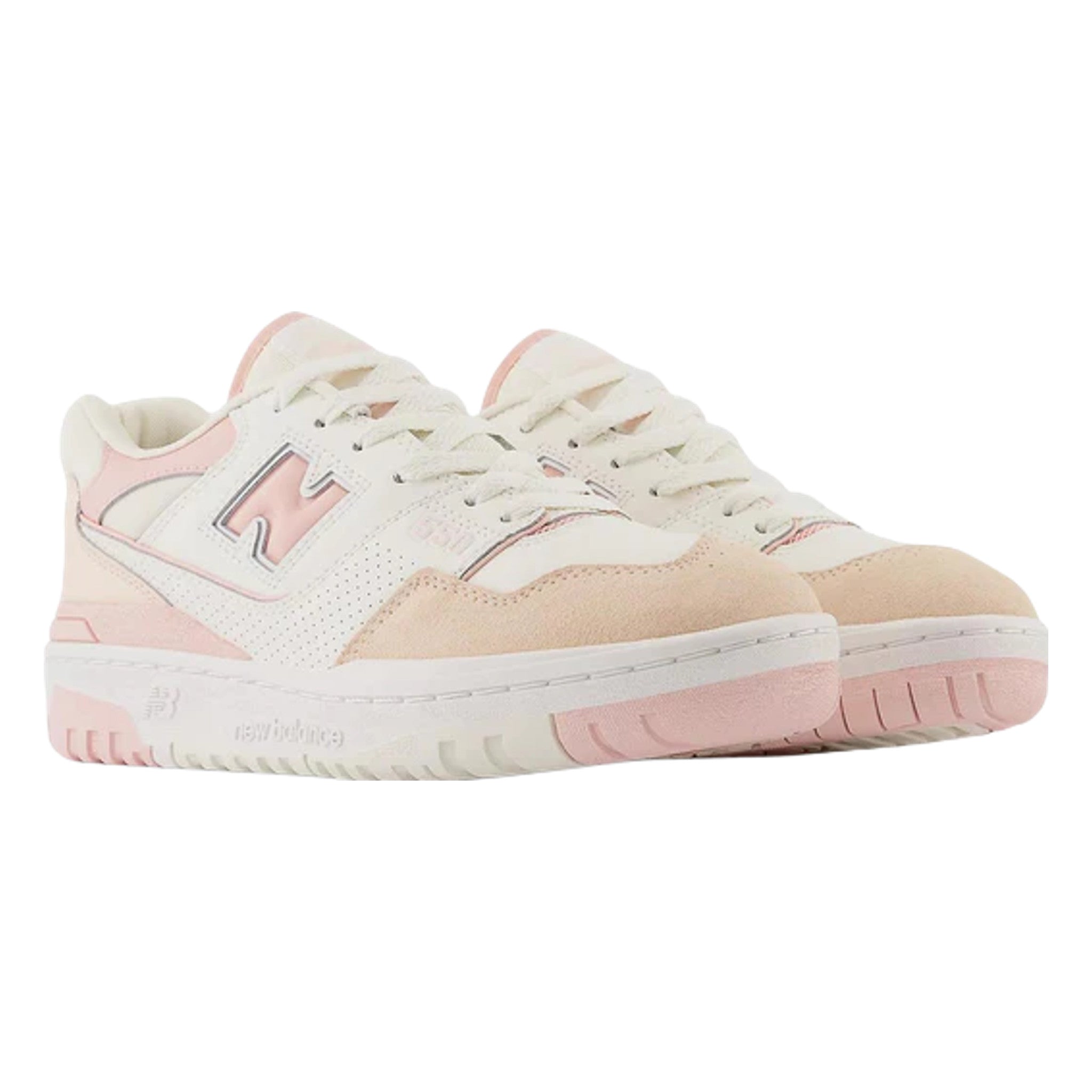 Step into a world of pastel perfection with the New Balance 550 WMNS "White Pink." This charming sneaker features a crisp white leather upper accented with soft, feminine touches of pink. The iconic "N" logo and heel clip are adorned in a delicate petal pink, while the collar boasts a matching pink hue. For a touch of contrast, the forefoot and heel overlays showcase a subtle peach suede. This versatile shoe, perfect for both casual and sporty looks, sits atop a traditional rubber cupsole with a foam wedge for lightweight cushioning and a comfortable fit.