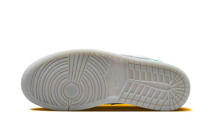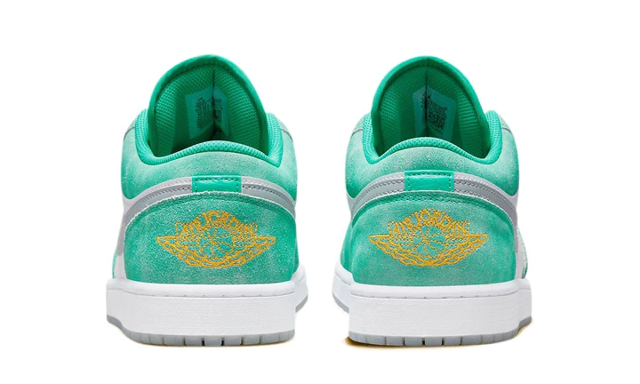 The Ar Jrdan 1 Low SE “New Emerald” is a clean look for the popular lifestyle shoe meant for casual wear. The “New Emerald” features white leather on its perforated toe and mid-panel. Contrasting New Emerald suede overlays contrast the neutral-colored base. A silver leather appears on either side of the shoe while yellow “Wngs” branding is embroidered on the heel. Both the and “Ar” logos on the white leather tongue are also designed in yellow. A two-tone, white midsole and grey rubber outsole completes the look.