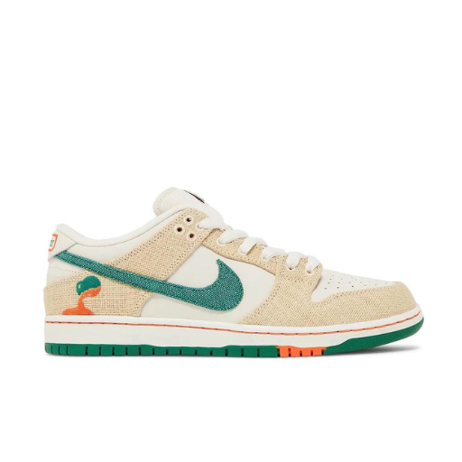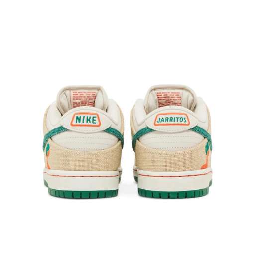 The Jarritos x Nike Dunk Low SB (FD0860-001) is a collaboration inspired by the popular Mexican soda brand. The upper combines a white leather base with hemp canvas overlays and a green textile Swoosh. The Jarritos logo is embroidered in green and orange on the heel, while dual