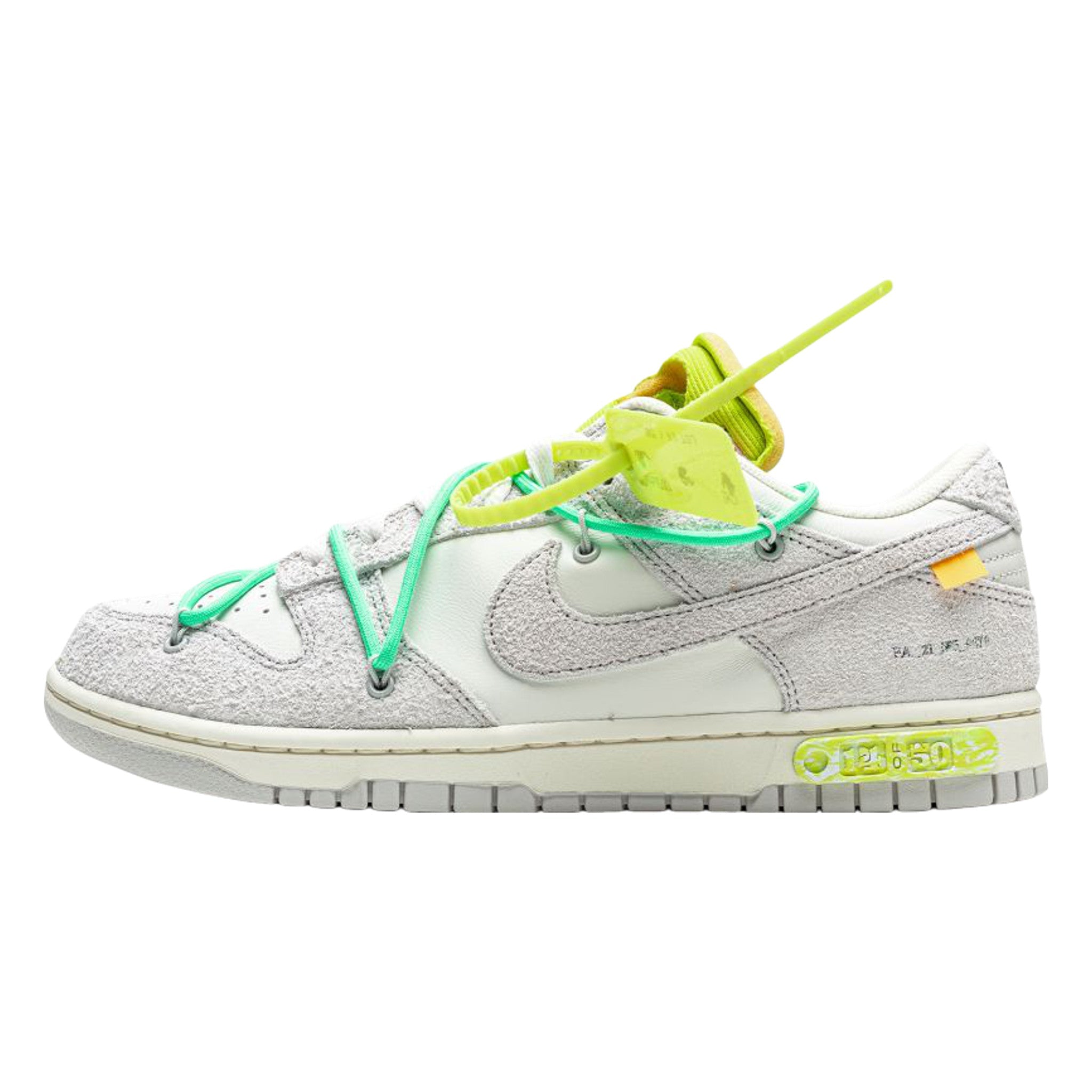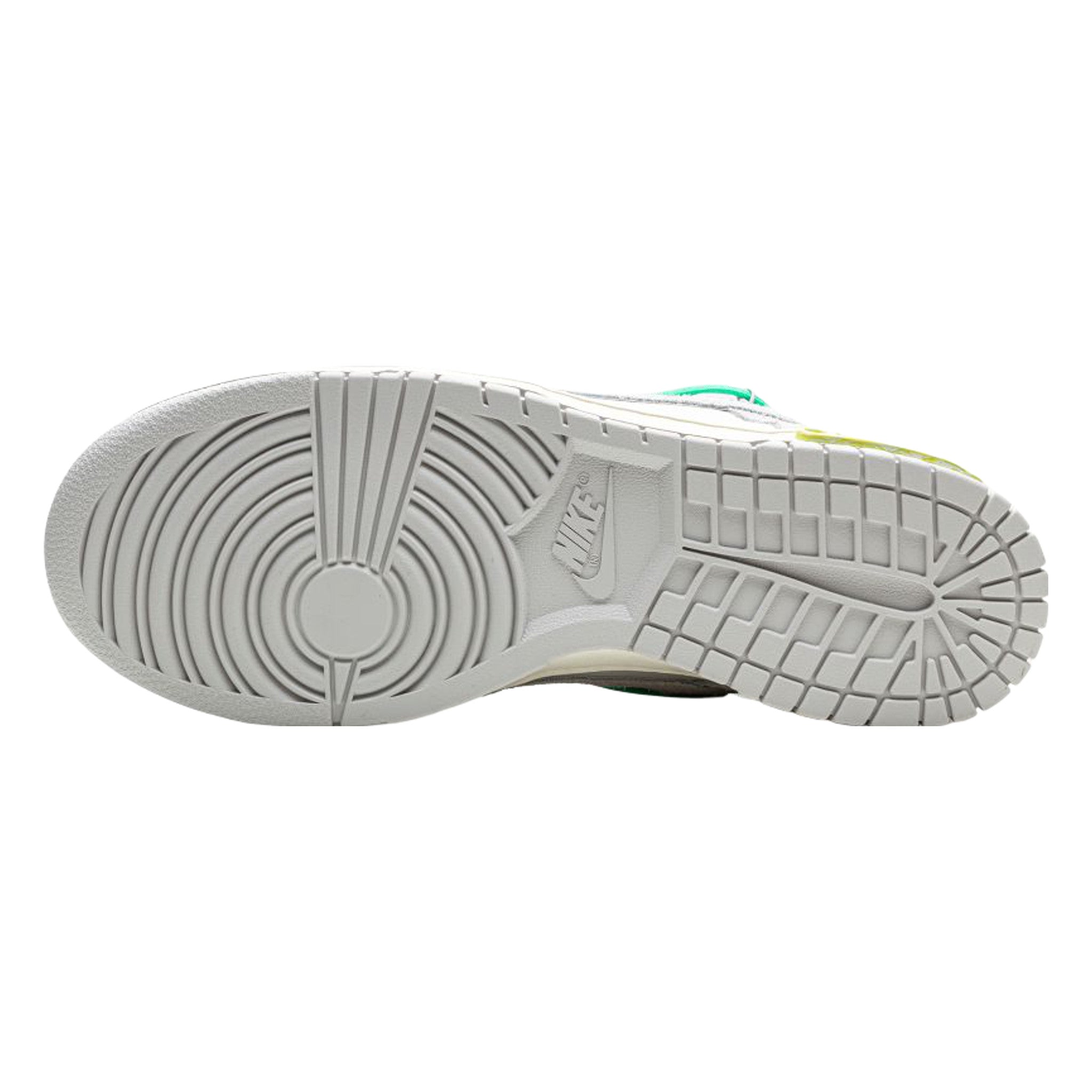 White/grey/yellow/green leather x Off-White Dnk Low "14/50" sneakers from Nke featuring signature logo detail, embroidered logo to the rear, slogan print, contrasting panel detail, round toe, rope detailing, branded insole and rubber sole. These styles are supplied by a premium sneaker marketplace. Stocking only the most sought-after footwear, they source and curate some of the most hard to find sneakers from around the world..