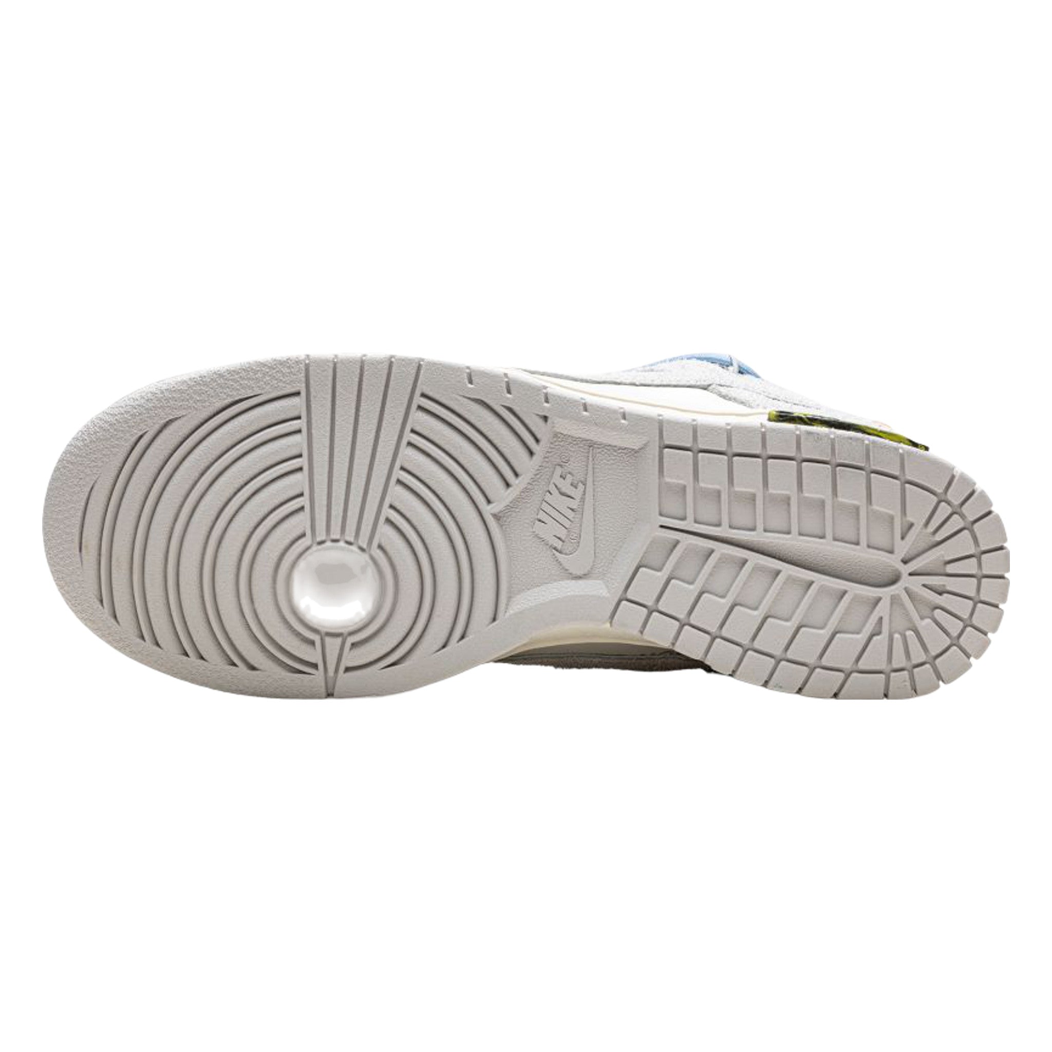The Off-White x Nke Dnk Low “Lot 38” is one of multiple colorways of the vintage basketball shoe designed by Virgil Abloh for the “Lot 50” collection. The series, which was released by Nke in August 2021, features 50 unique colorways of the classic low-top shoe. “Lot 38” features a Sail leather base with Neutral Grey suede panels and branding. Black “Nke” branding appears on the heel and Off-White’s signature Helvetica detailing is found on the medial side. A secondary, bungee cord-like lacing system appears on the upper. The look originated on the first Off-White x Nke Dnk collection from 2019. A traditional lacing setup can also be found on the shoe. On the midsole, a marbled mint yellow-and-black insert with “Lot 38 of 50” branding completes the look.