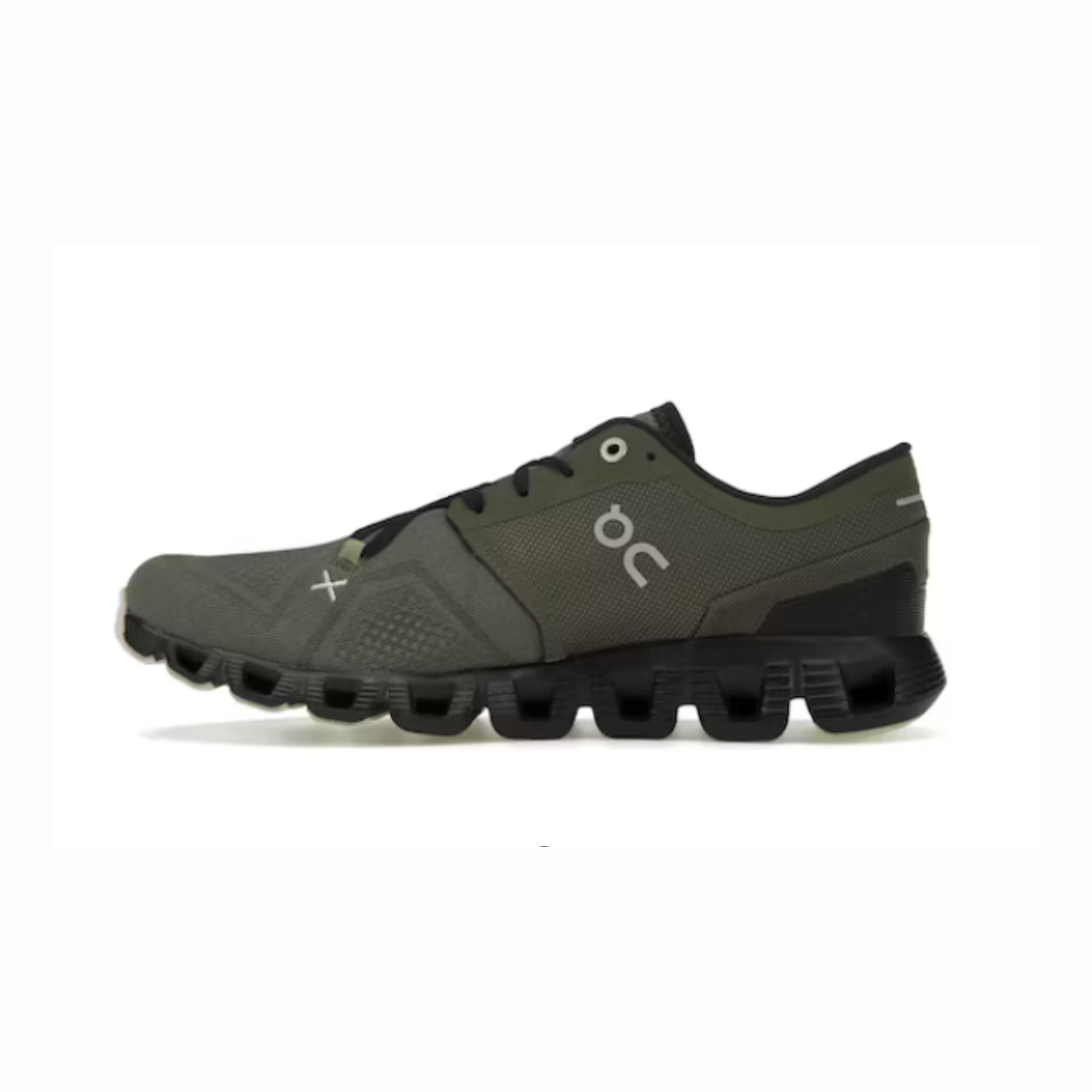 On Running Cloud X 3 Olive Reseda: Swiss-engineered for soft landings and explosive take-offs. Re-engineered 3-layer mesh with 90-95% recycled content for breathability. Wider platform for stability. Large Cloud elements for superior cushioning and energy return. Category: Neutral. Drop: 8 mm. Weight: 8.57 oz."