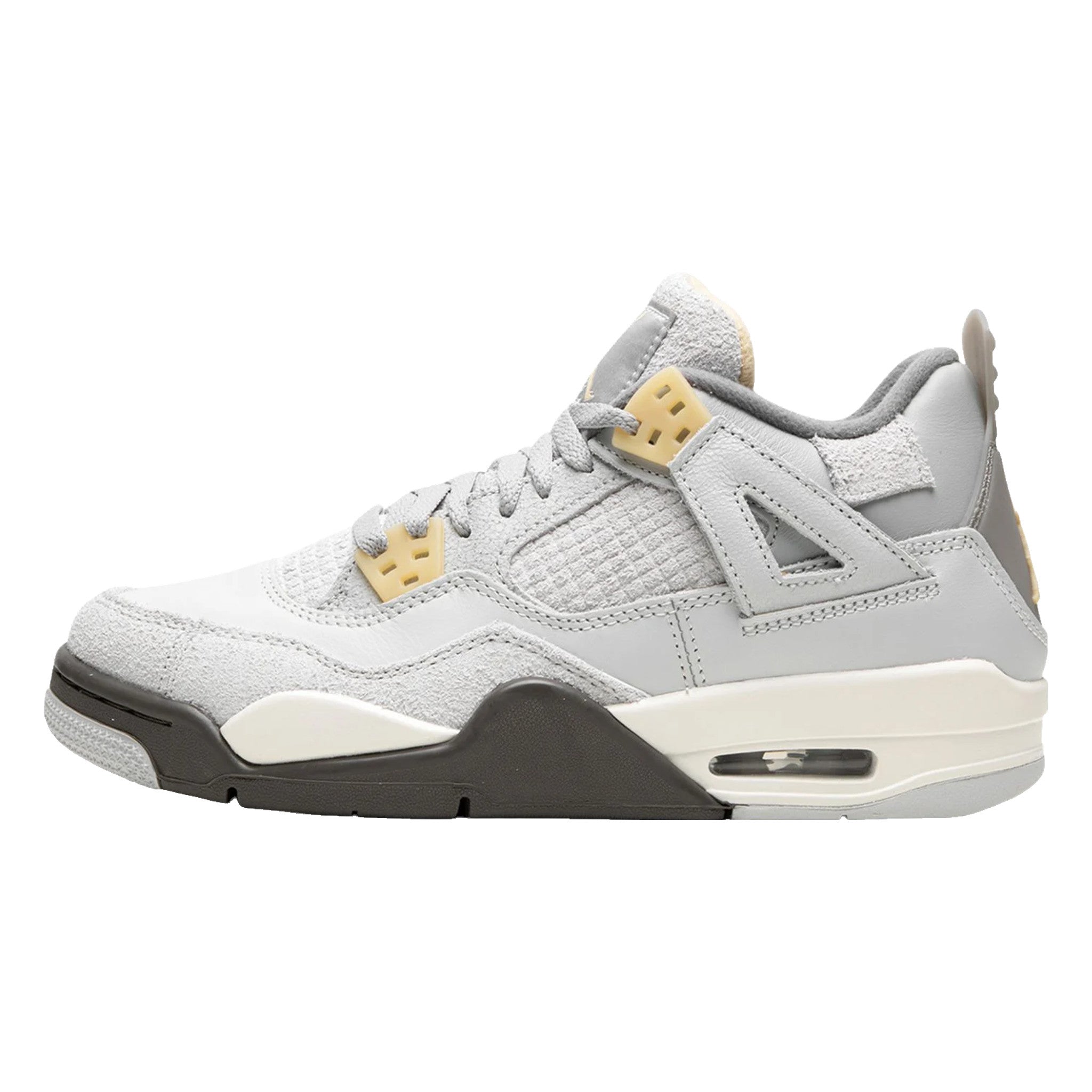The Ar Jrdn 4 Craft GS “Photon Dust” is the youth sizing of the modified version of the classic basketball shoe made from a compelling combination of materials. From a greater collection of “Craft” sneakers, the Jrdn 4 Craft “Photon Dust” is complete with an upper constructed from a mix of leather, suede, and textiles—all in neutral hues. The oxidized design of the lace eyelets and the logo on the heel gives the shoe a decidedly vintage look. Underfoot, a cream-tinged midsole appears below a grey suede overlay on the forefoot. A combination of light and dark grey panels are found on the outsole