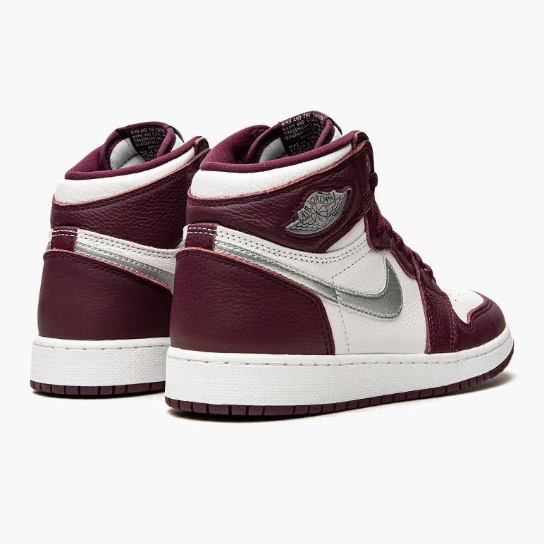 The Ar Jrdn 1 Hgh OG GS “Bordeaux” is the youth sizing of Michael Jrdan’s retro basketball shoe in an autumn-inspired colorway. A November 2021 release, the “Bordeaux” style for the popular high-top shoe is loosely inspired by the Ar Jrdn 6 and Ar Jordn 7 colorway of the same nickname. The Air Jordn 1 continues the ‘90s theme with a mostly two-tone, white-and-maroon-colored look. The perforated toe, mid-panel, and collar are arranged in white tumbled leather. Contrasting wine-red Bordeaux leather can be found on the forefoot, eyelets, collar, and heel. A Metallic Silver leather graces both sides of the shoe and a silver “Wngs” logo is located on the collar. Classic white “Nk Ar” branding is printed on the Bordeaux nylon tongue tag on the top of the white nylon tongue.