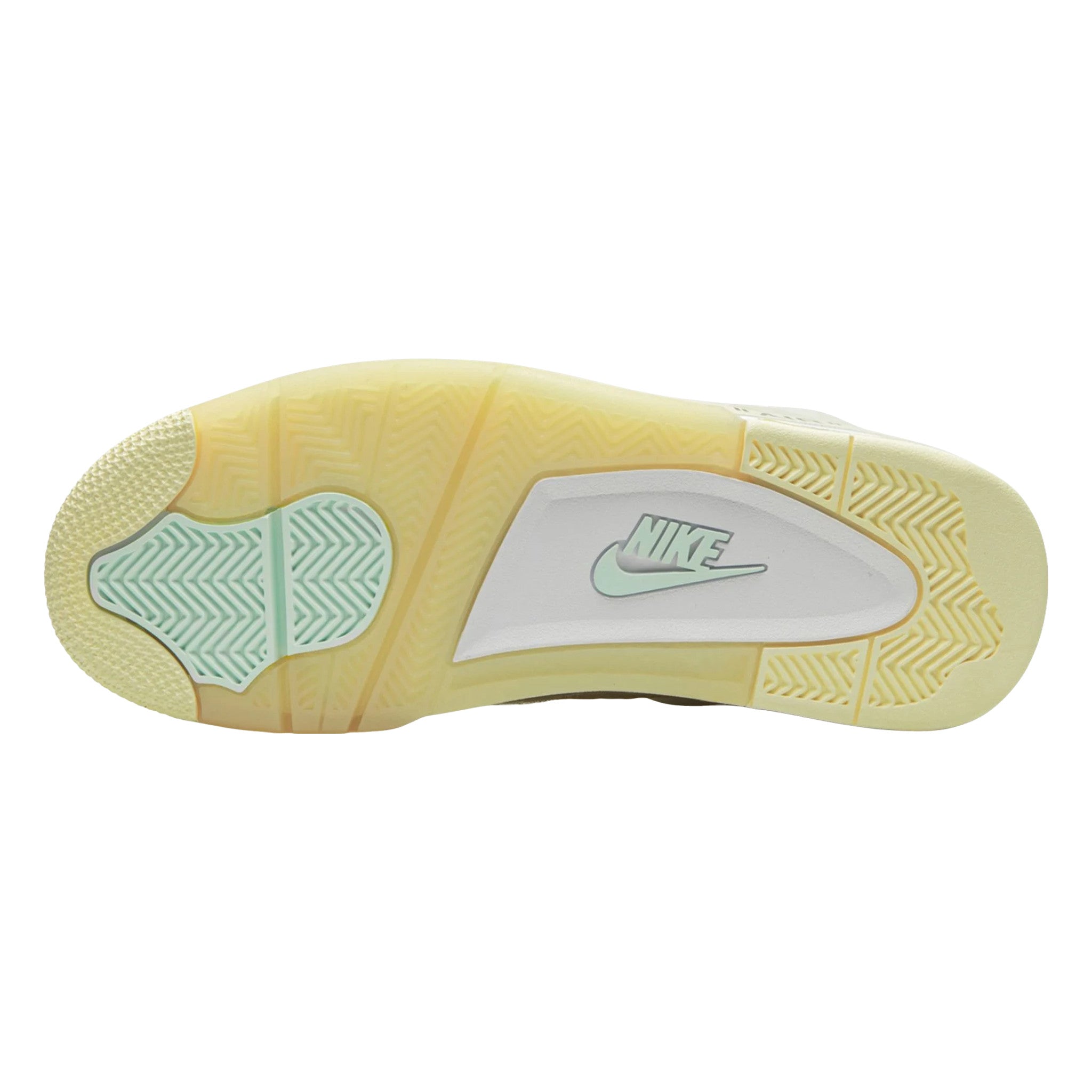 The women's Off-White x Ar Jordn 4 “Sail” is a highly desirable collaboration between Virgil Abloh’s fashion label and Jordn Brand on Michael Jordn’s fourth signature shoe. Originating as a sample during Abloh’s “Figures of Speech” exhibit in Chicago’s Museum of Contemporary Art in Fall 2019, this clean colorway received an official retail release in Summer 2020 to much fanfare. The signature “quotations” aesthetic of Abloh’s Jordan Brand collaborations underpins this Sail colored shoe, including “Ar” branding printed on the midsole and “shoelace” detailing in black lettering on the laces. Translucent detailing, including the heel cup, Wings clips on the collar, and netting on the midsole and throat are all firsts for the Jordn 4. The visible Ar window in the heel is surrounded by a white midsole.