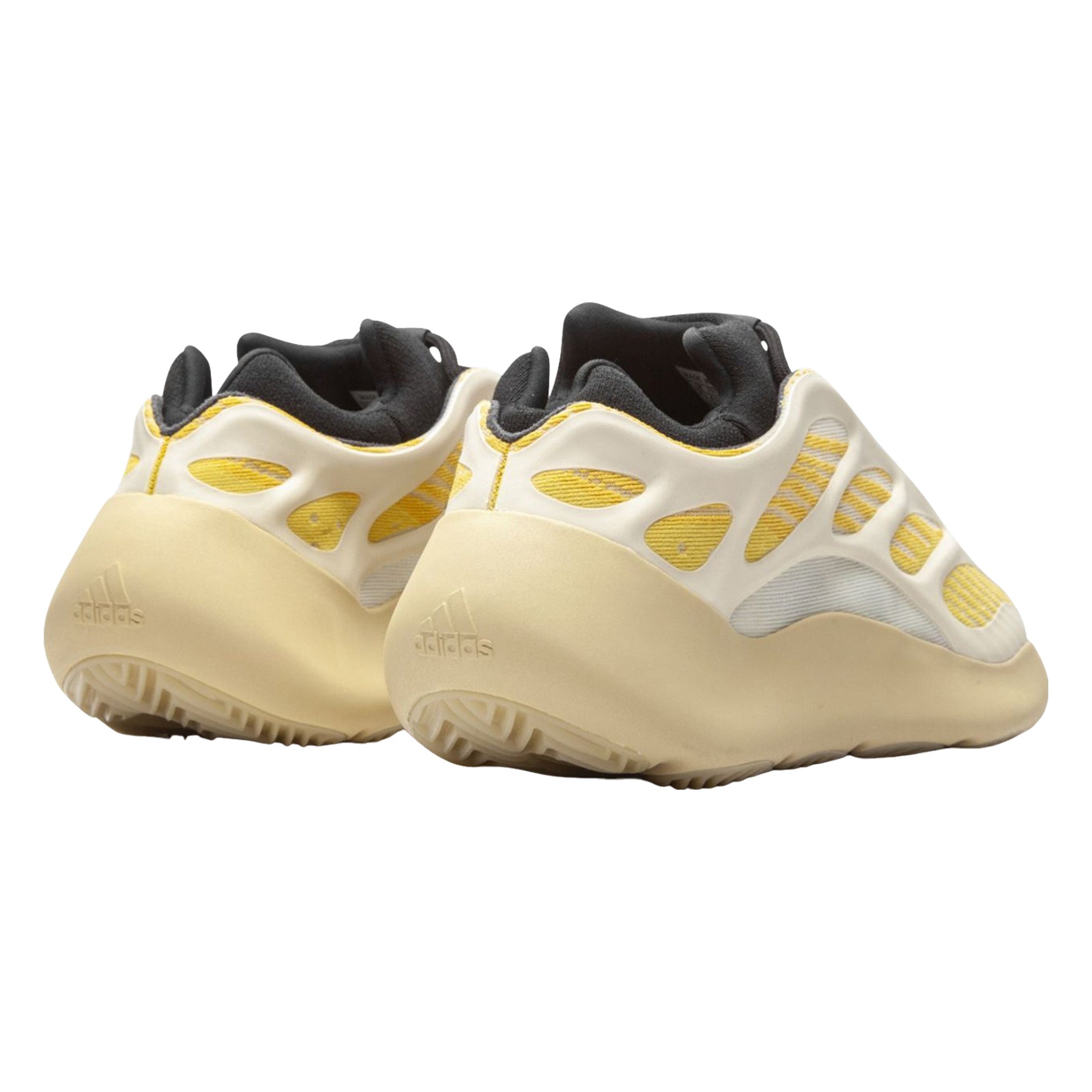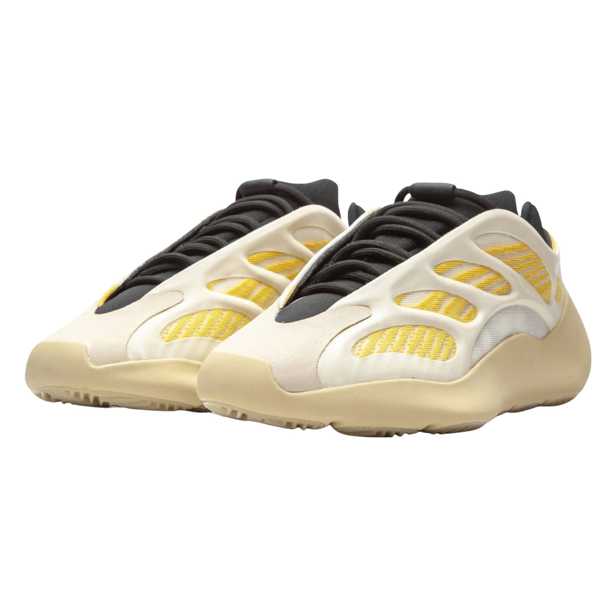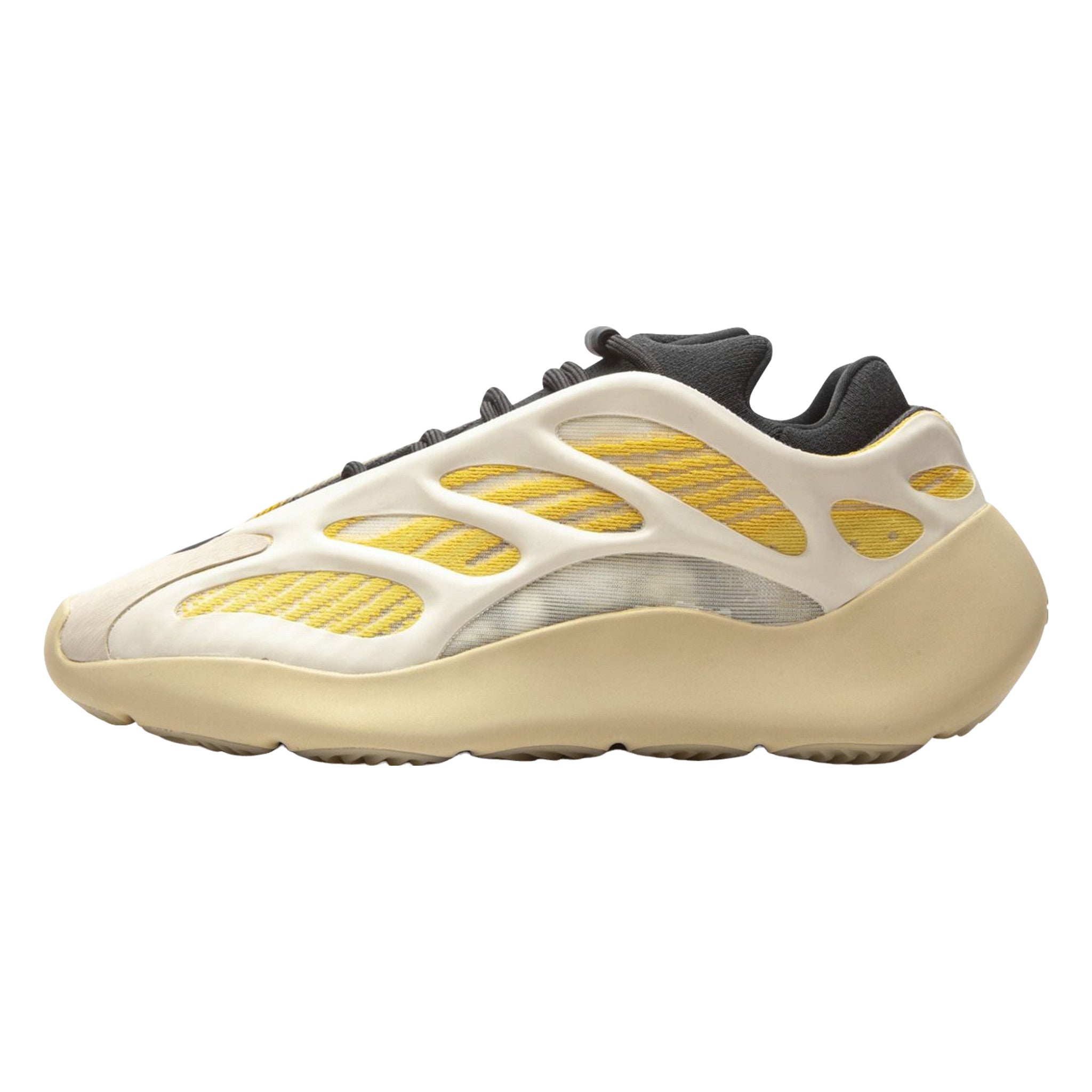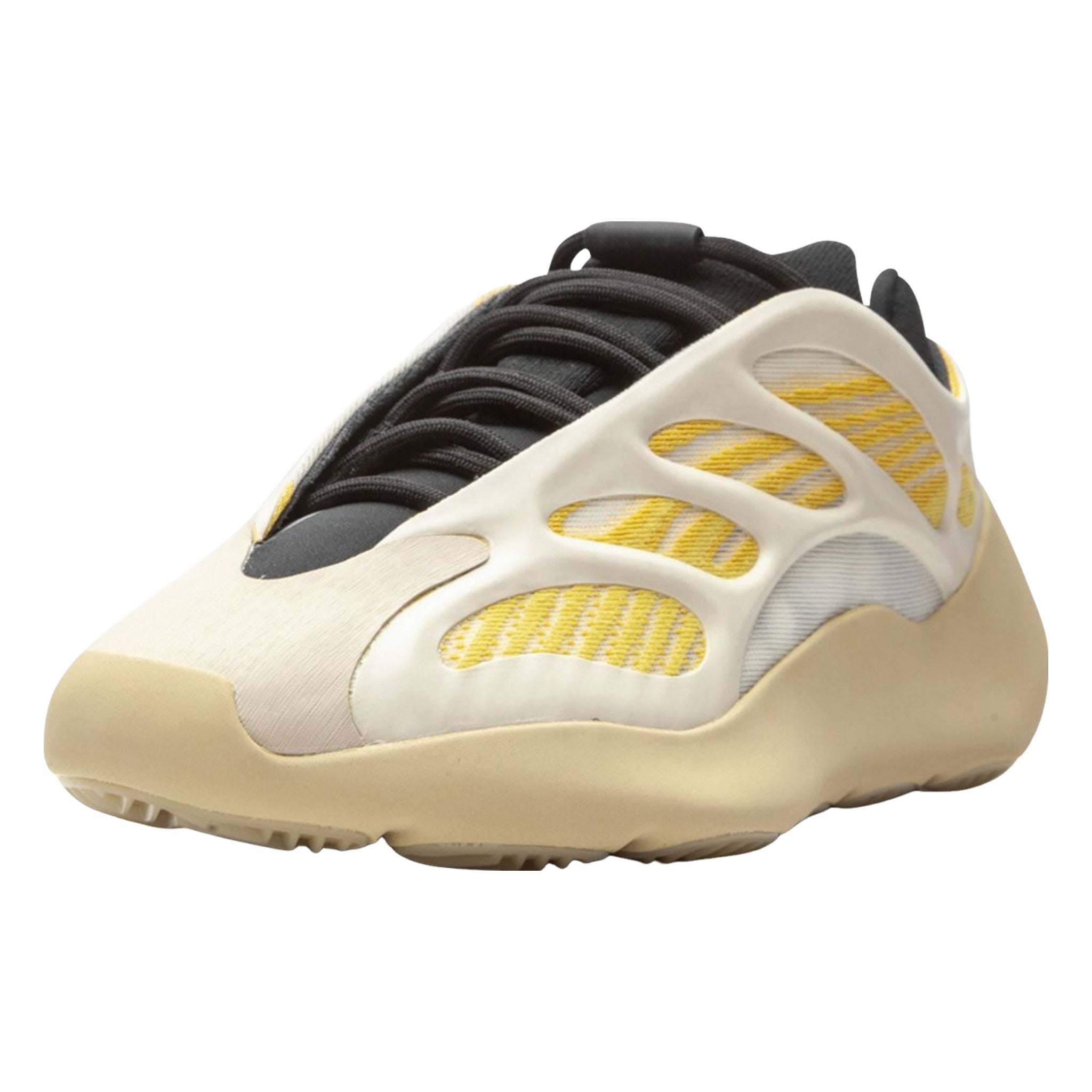 The Yzy 700 V3 “Safflower” is a Fall 2020 release of the futuristic Yzy silhouette. The evolutionary Yzy 700 V3 is part of Kanye West’s signature shoe line withs. It is the third Yzy 700, and the first model to remove adidas’s Bst cushioning from its design. The sock-like Primeknit upper displays contrasting yellow and grey stripes beneath the overlaid TPU “caging” system that provides a lockdown fit to the wearer. A black neoprene tongue and collar are arranged in a bootie-like construction for additional support. Lightweight and responsive EVA foam in a cream finish completes the look of the progressive offering from  Yzy.