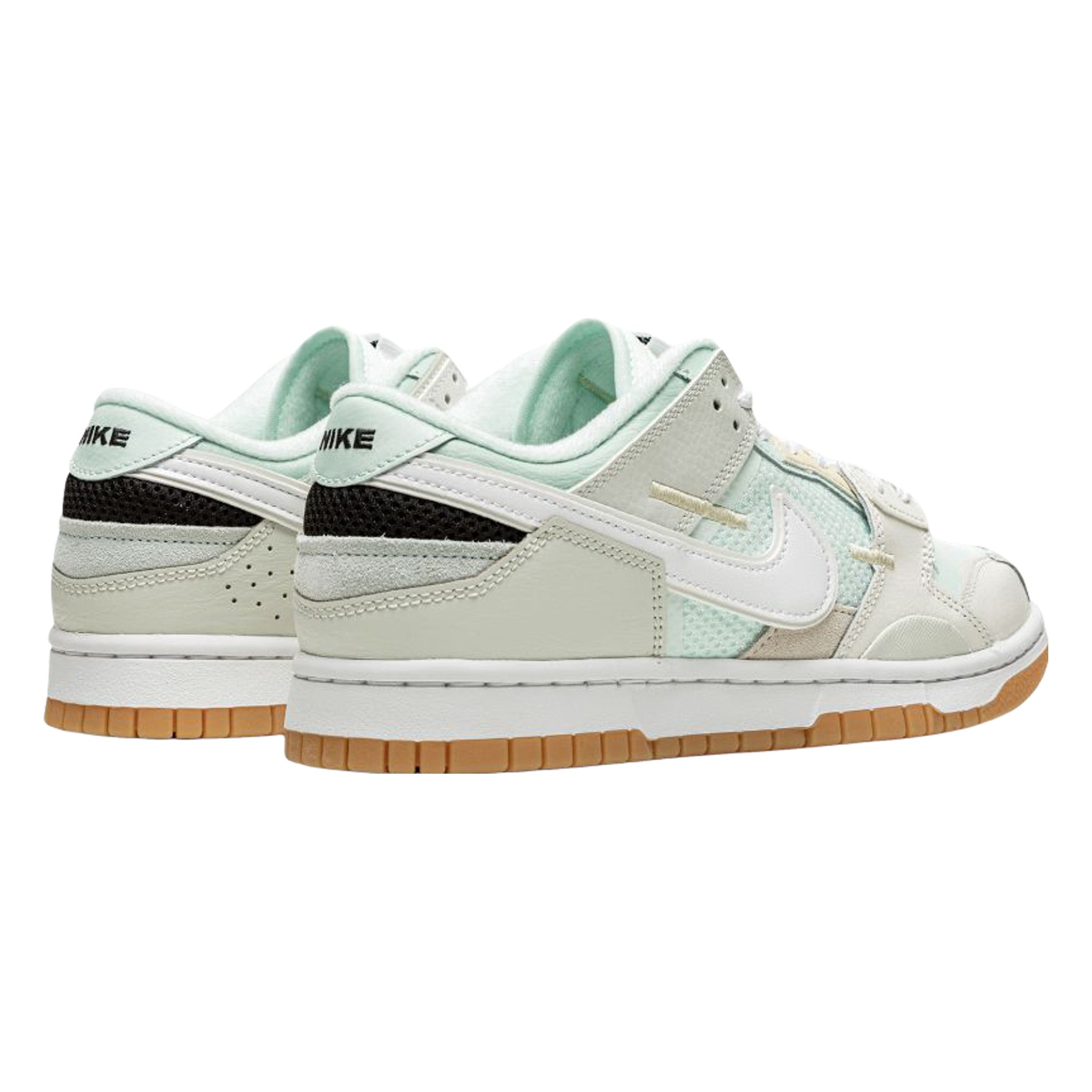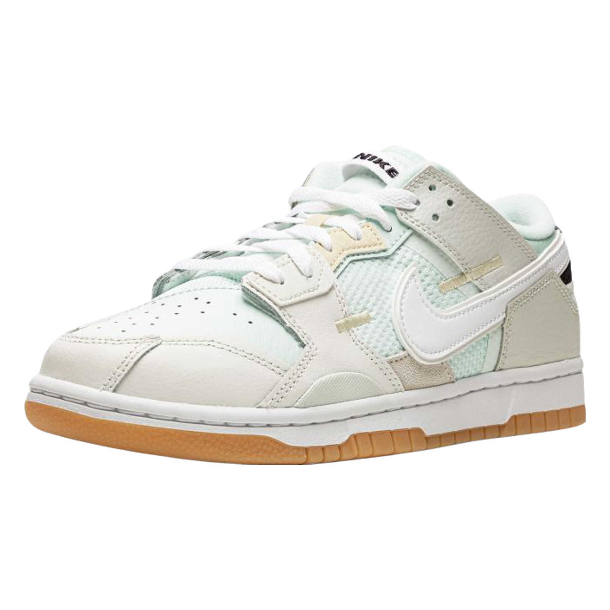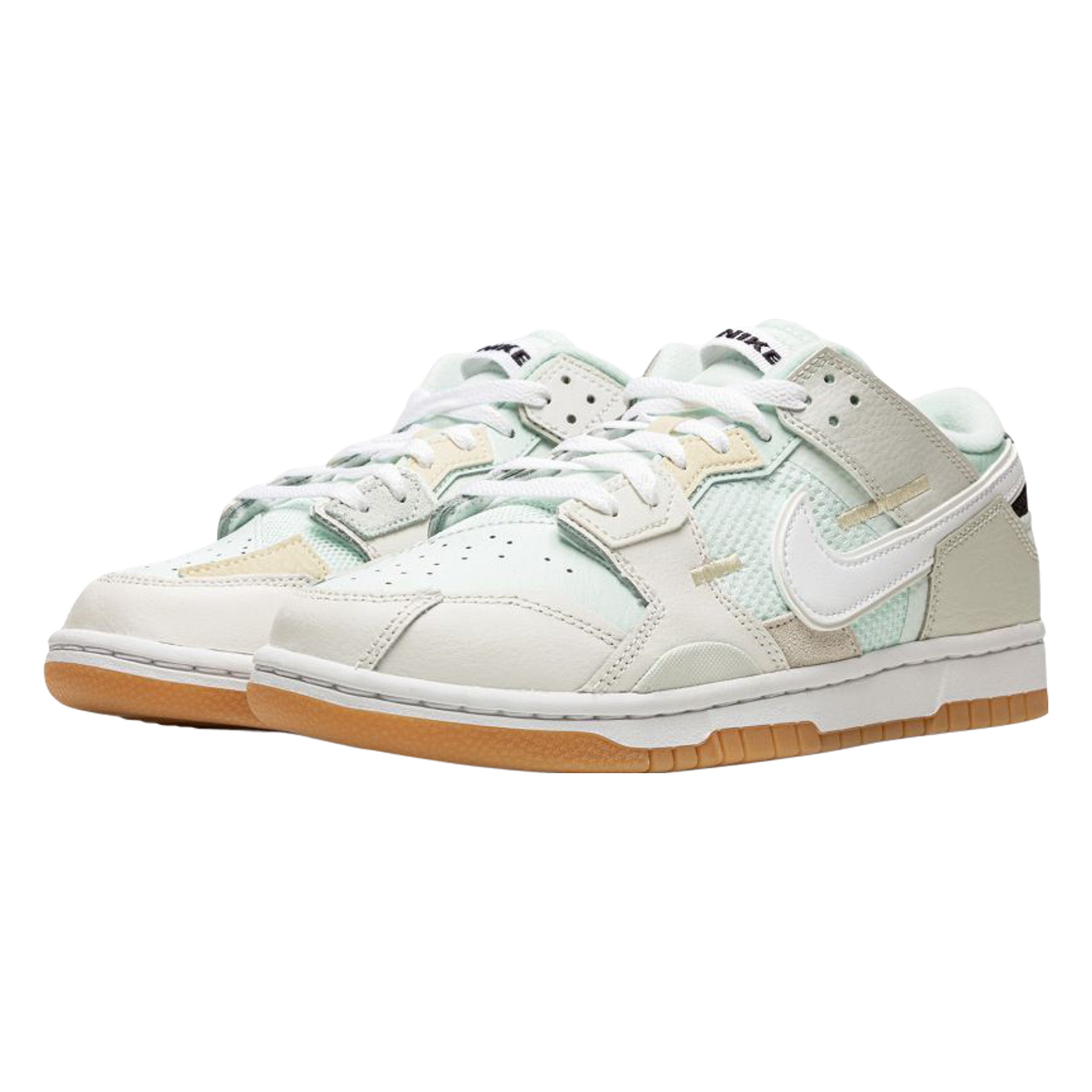 The Nke Dnk Low Scrap “Sea Glass” is a patchwork-like construction of the classic sneaker that was released in August 2021. Interestingly enough, the Dnk Low Scrap is an alternate version of the popular lifestyle shoe that is inspired by a cobbler’s cutting room floor. The patchwork upper features mesh, leather, and suede in hues of Sail, Sea Glass, and Seafoam with white and black detailing. Modern-looking “Nke” branding is printed on the heel and tongue tag. The shoe is rounded into form with a white midsole and gum rubber outsole.