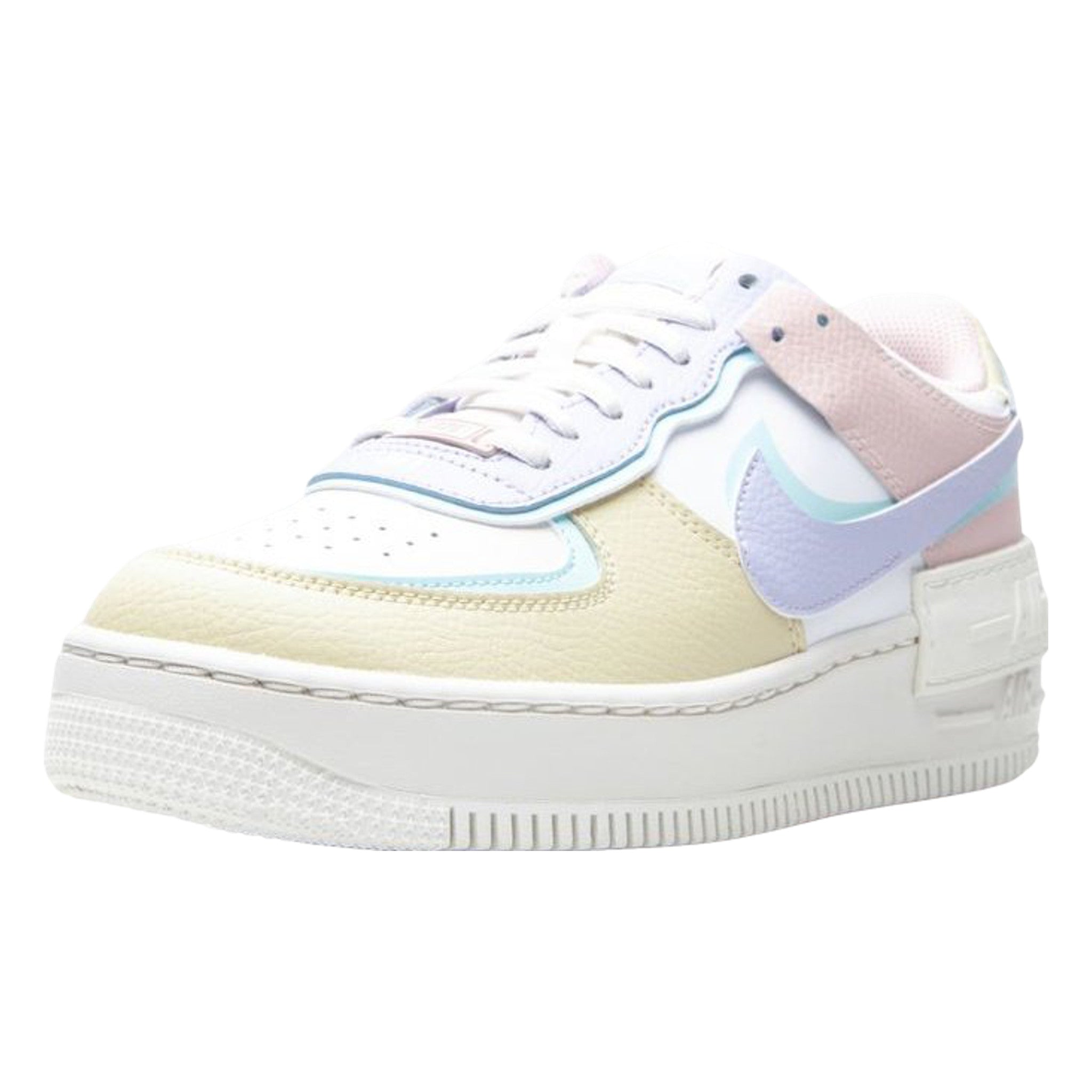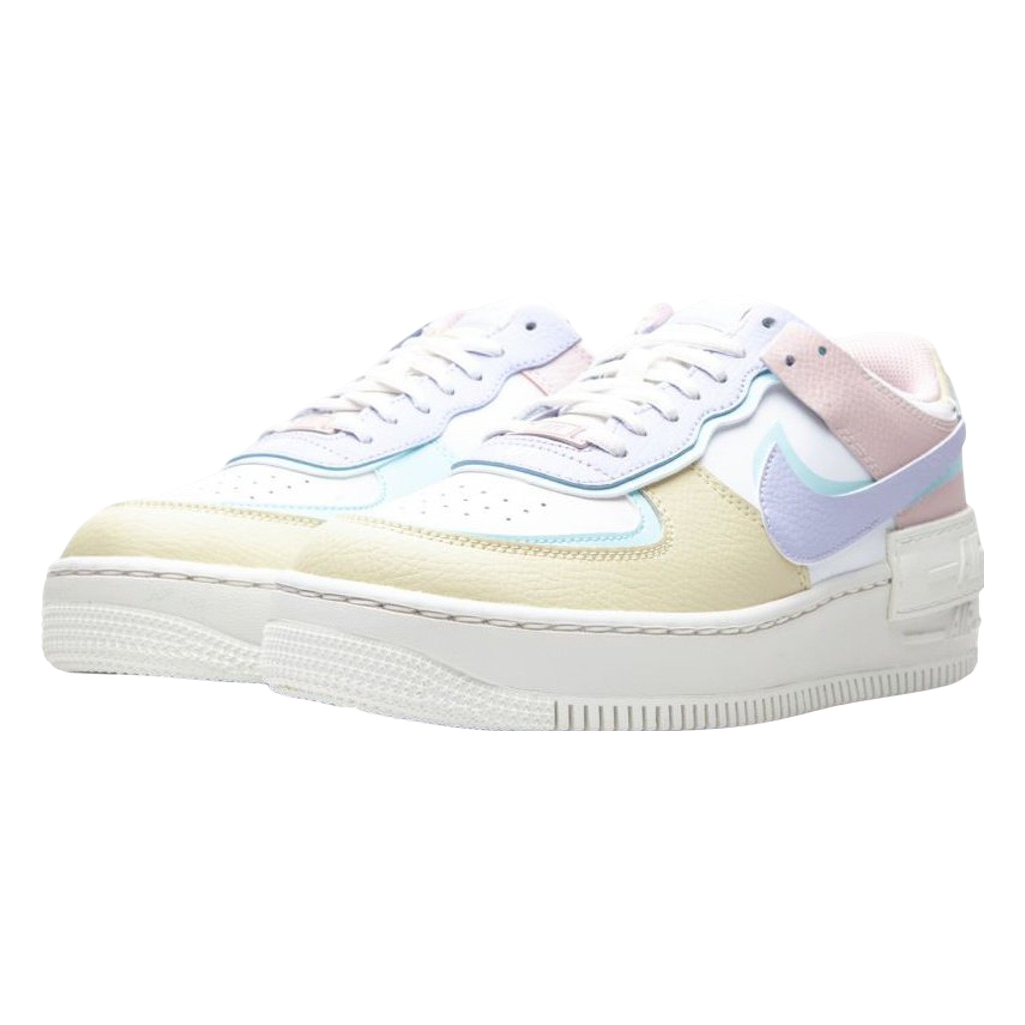 The Women’s nk Ar Frc 1 Low Shadow “Pastel” is a “do-it-yourself” inspired look for the classic “Uptown” for women. Without saying as much, the “Pastel” is decidedly “Easter” in appearance with abstract pastel panels highlighting its design. A muted shade of yellow tumbled leather appears on the forefoot and toe cap and contrasting violet tumbled leather dots the raised eyelet panel. A teal leather panel borders the aforementioned yellow overlay on the forefoot. The layered branding on the mid-panel draws similarities to the “stacking” effect popularized by sacai’s sneaker collaborations with NK. On the back of the shoe, NK places a light pink tumbled leather panel on the lateral side of the heel. A retro inspired script “NK” logo is embroidered onto the purple pastel leather heel tab. NK layers a white rubber “Ar” overlay above the midsole on the heel to create a unique stacking effect to complete the look of the shoe.
