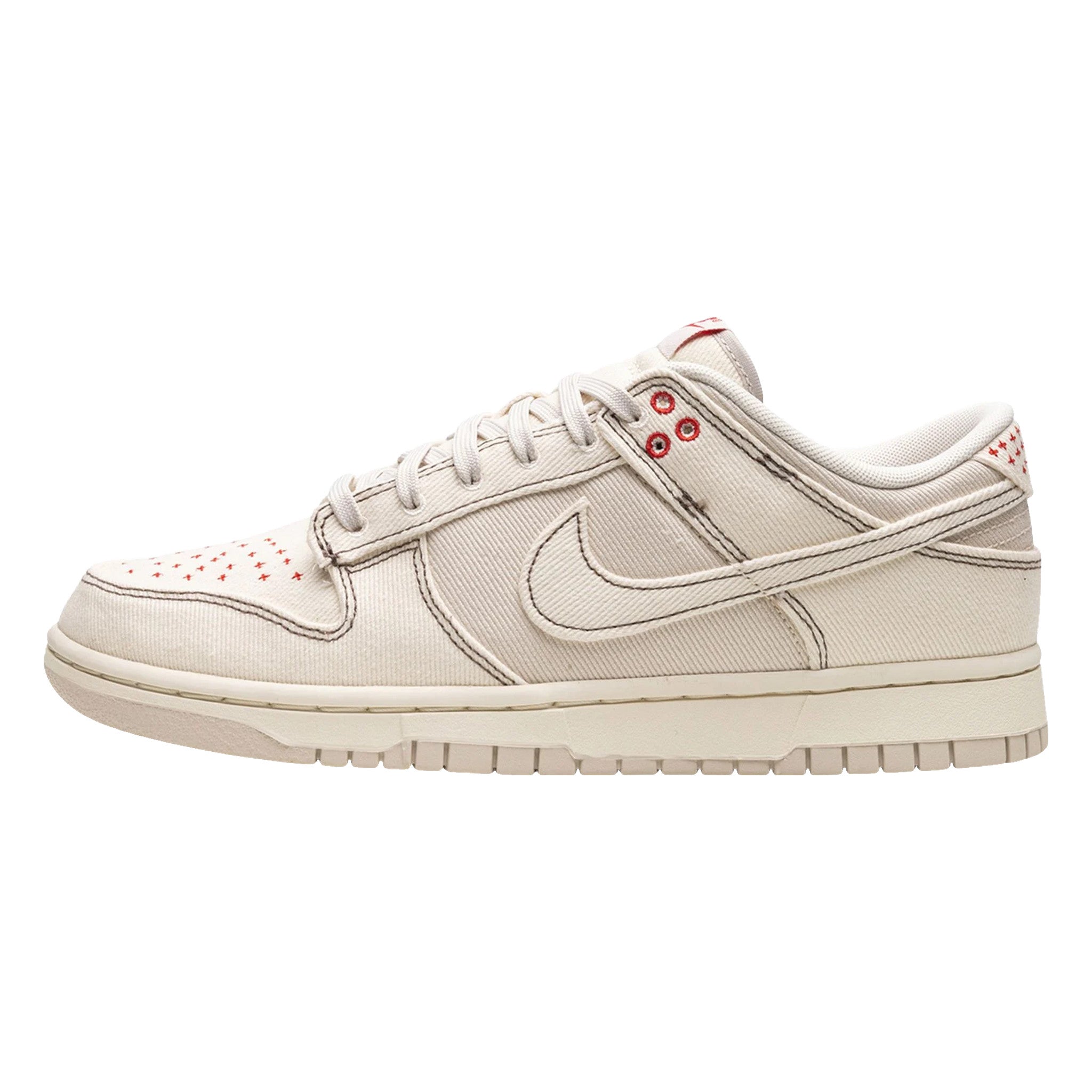 The Nke Dnk Low Shashiko “Light Orewood Brown” is a colorway of the vintage basketball and lifestyle shoe made from a sturdy twill material. On the “Light Orewood Brown,” the shoe features a tan textile base and tonal with contrasting brown stitching throughout. Contrasting red Shashiko stitching can be seen on the toe box and on the heel. The shoe’s mostly monochromatic tan appearance is continued on the midsole. A brown rubber outsole completes the look.