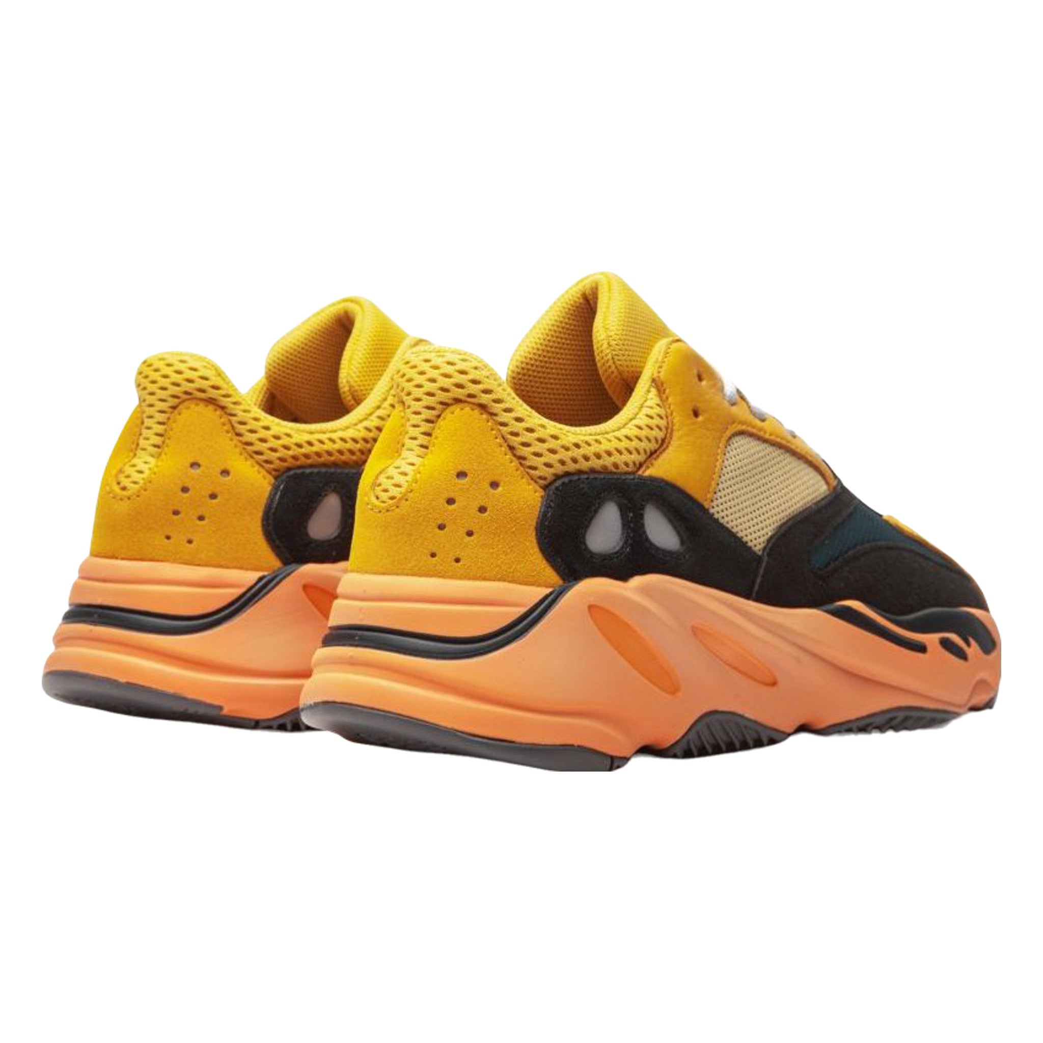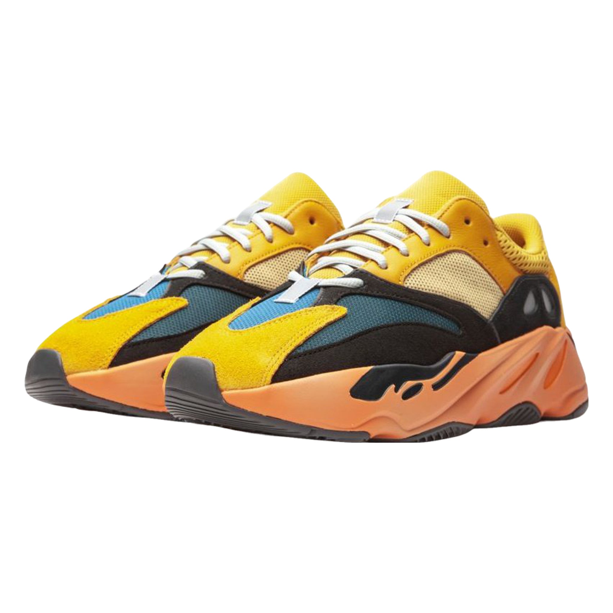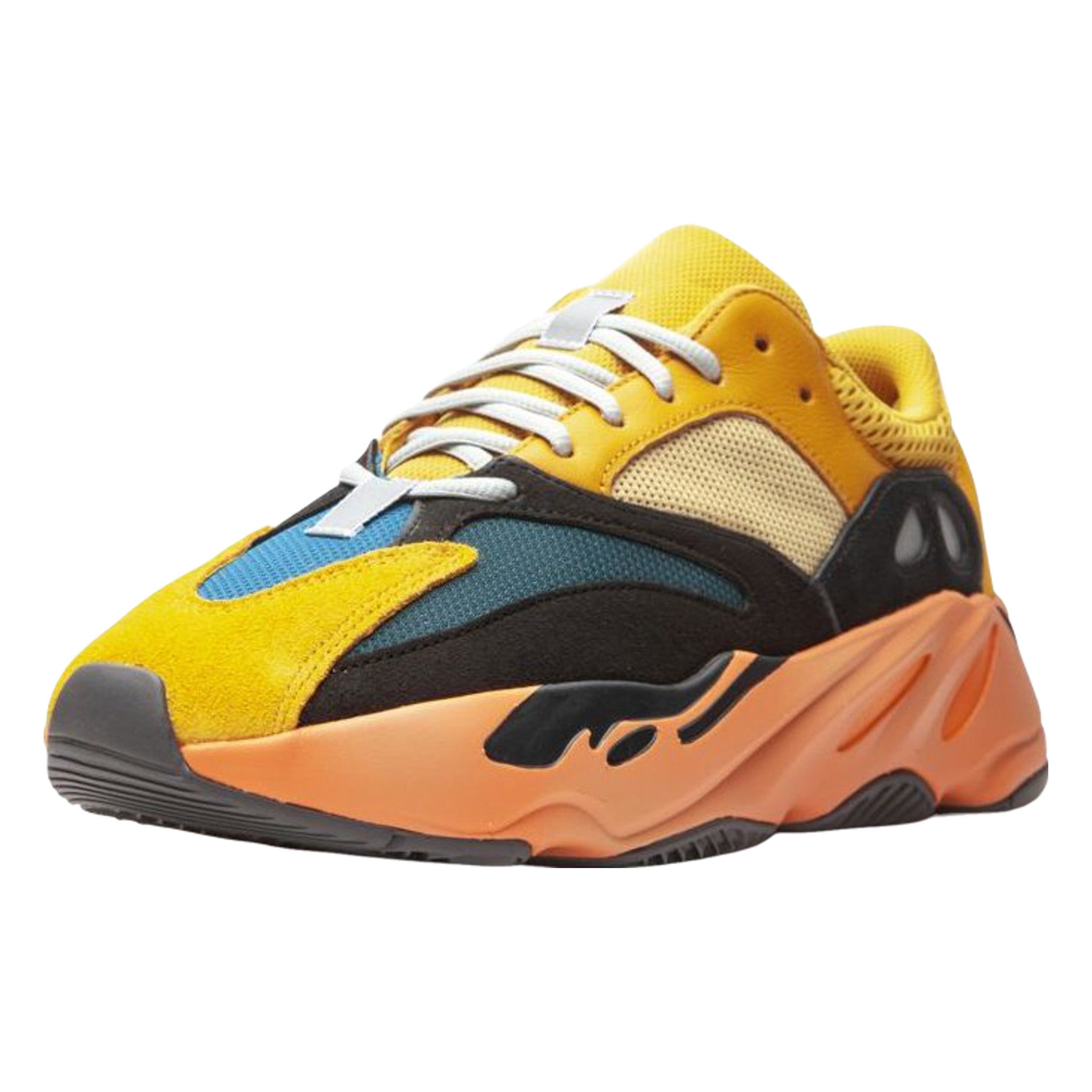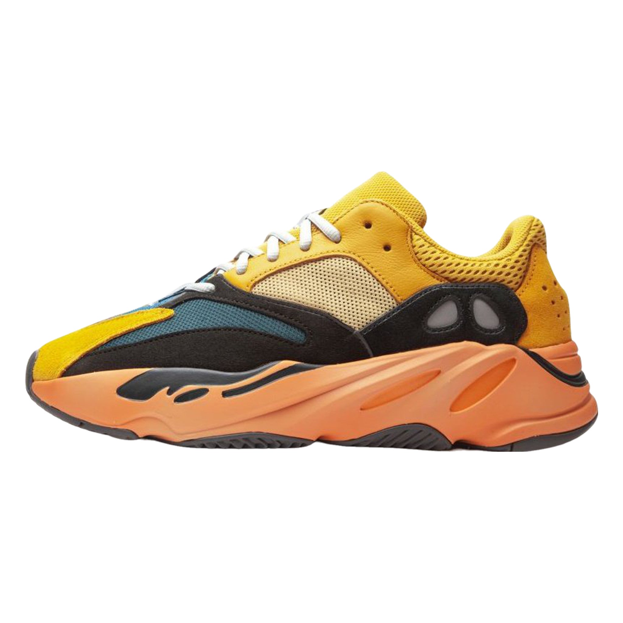 The Yzy Bst 700 “Sun” is a January 2021 release by and Kanye West that dresses the popular “dad shoe” in a vibrant colorway. The “Sun” combines warm shades of yellow and orange together to form one of the model’s most exciting makeups. employs Sun or yellow mesh detailing on the mid-panel and collar. A slightly darker shade of yellow can be found on the suede overlay panels on the eyelets, collar, toe, and heel. Elsewhere, black nubuck overlays on the forefoot are contrasted by a turquoise textile material. The chunky sculpted midsole is finished off in a sunny hue of orange. Adidas’s ultra responsive Bst cushioning is embedded within the midsole and provides the wearer with a responsive ride