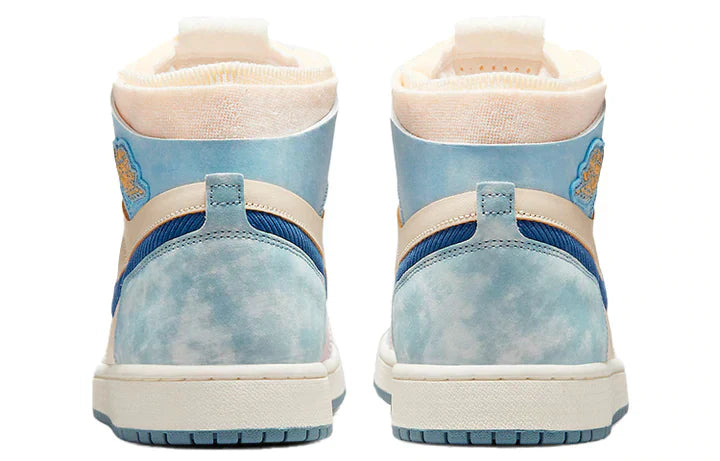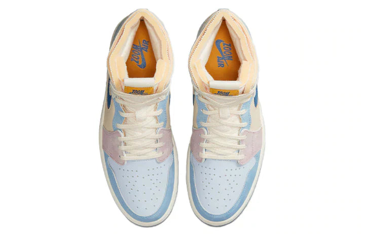 This offering of the Ar Jrdan 1 features a mix of blue tones throughout with corduroy-like material used on the cut-out. it comes constructed in a mix of leather and suede overlays with mesh collars and trims outsole. zoom air branded padded tongues and insoles complete the design.